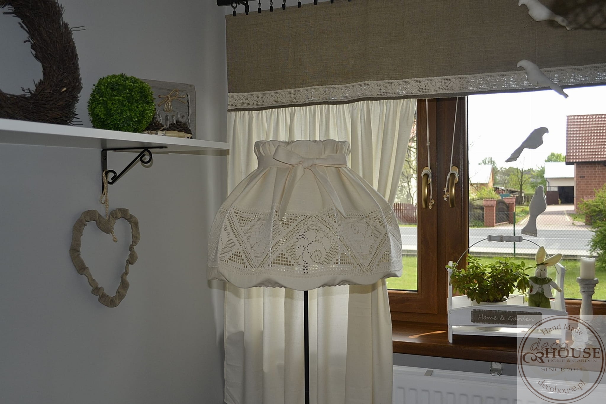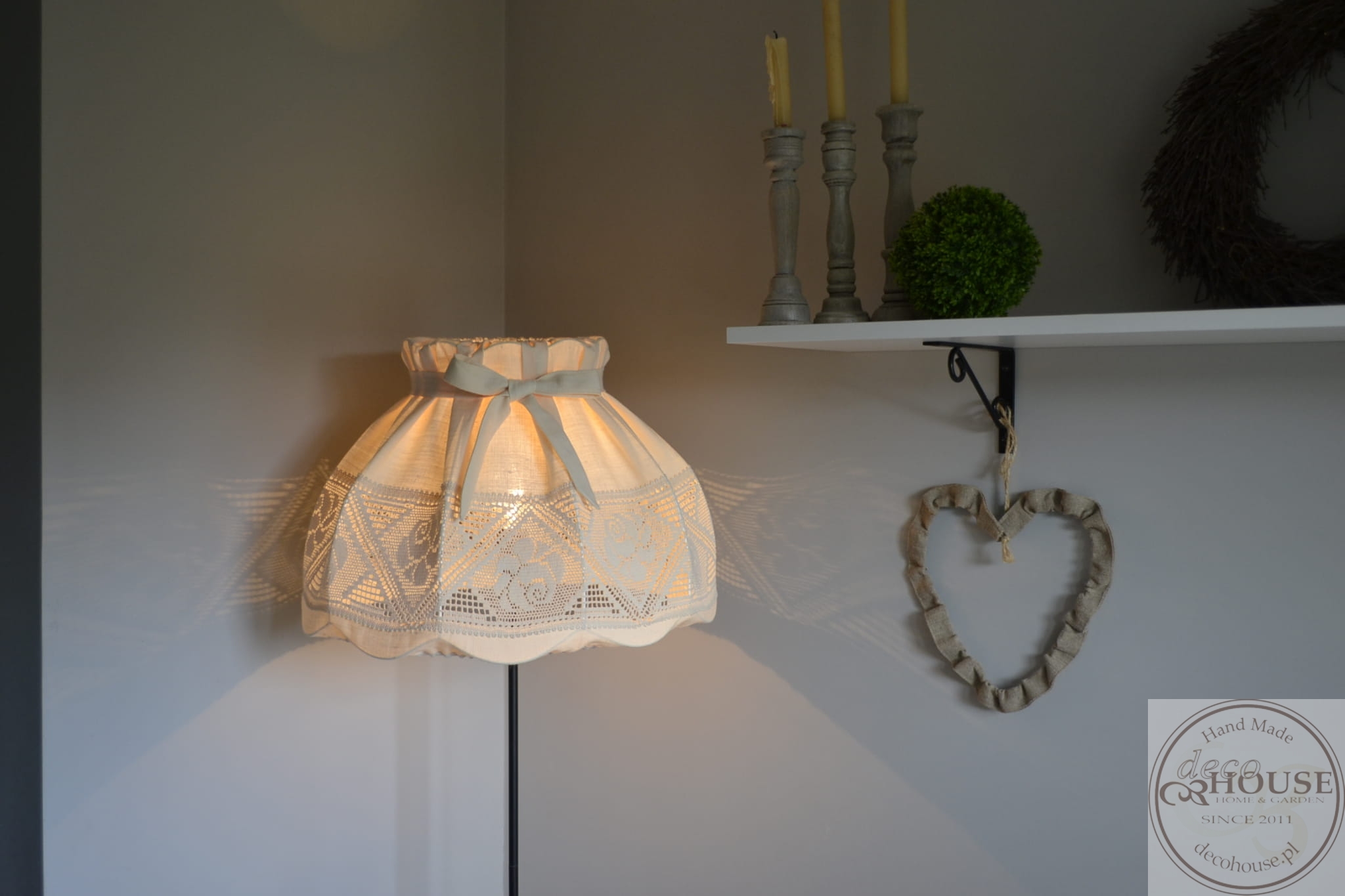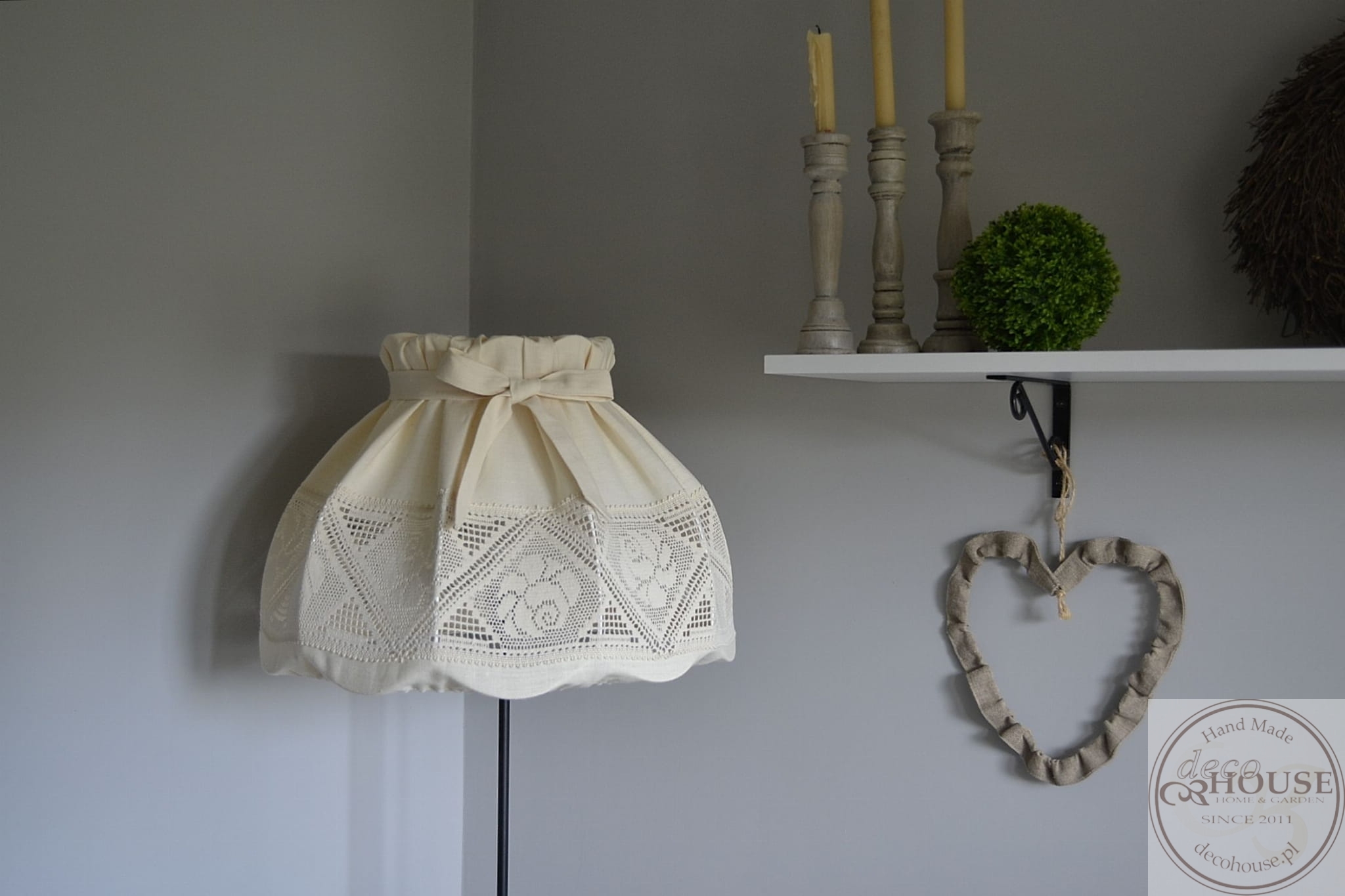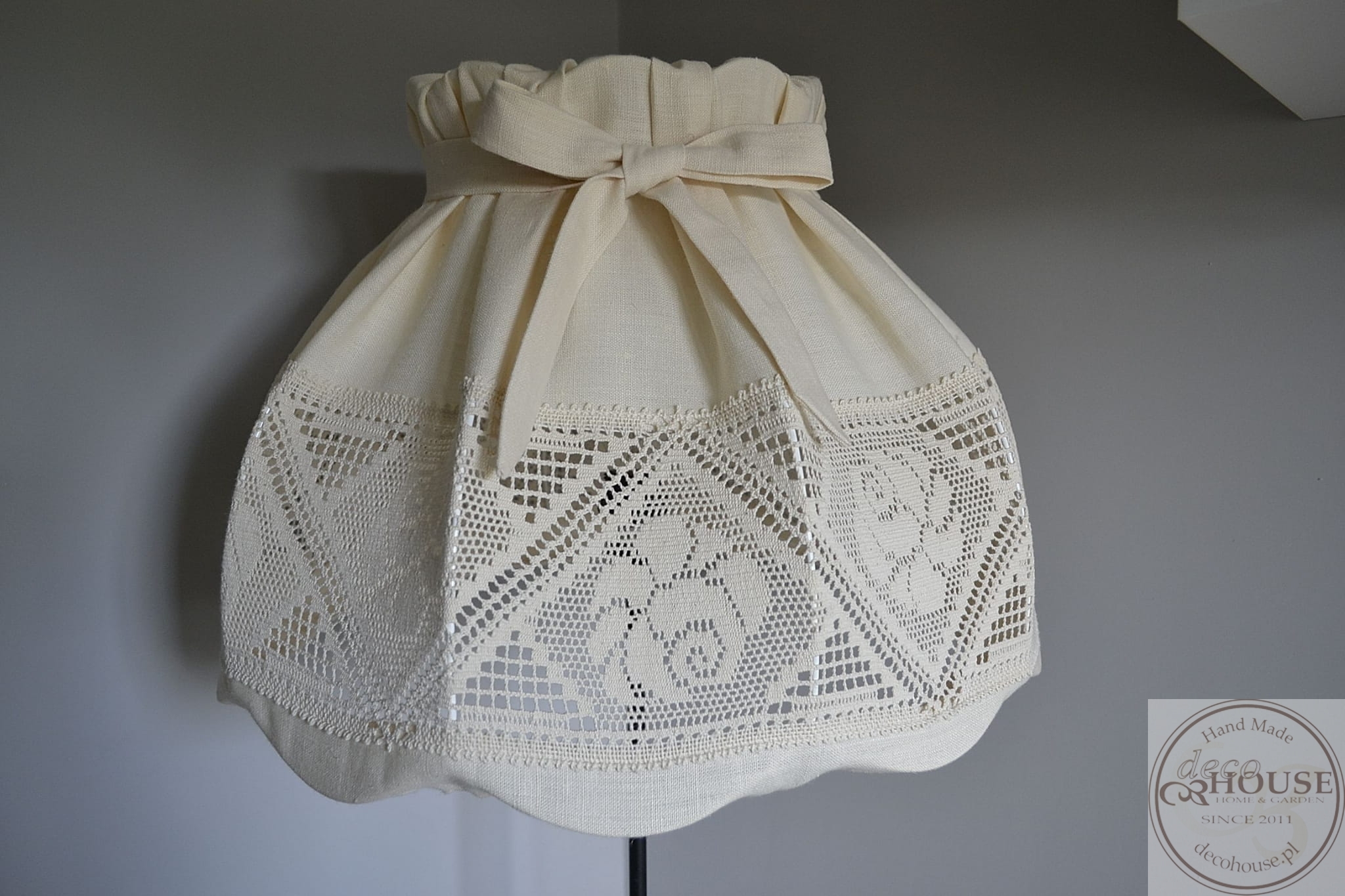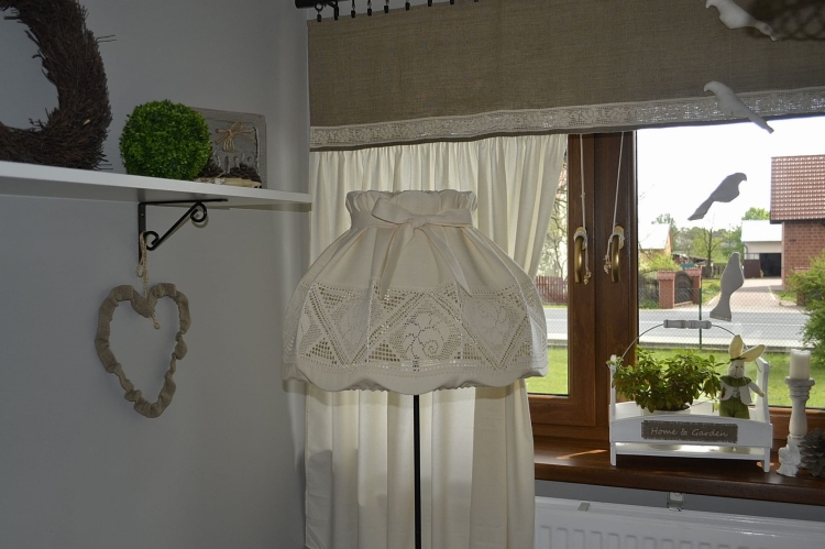Abażur z kremowej lnianej tkaniny z bawełnianą ozdobną koronką, z kokardką, górą i dołem na gumce, możliwość zdjęcia do prania.
