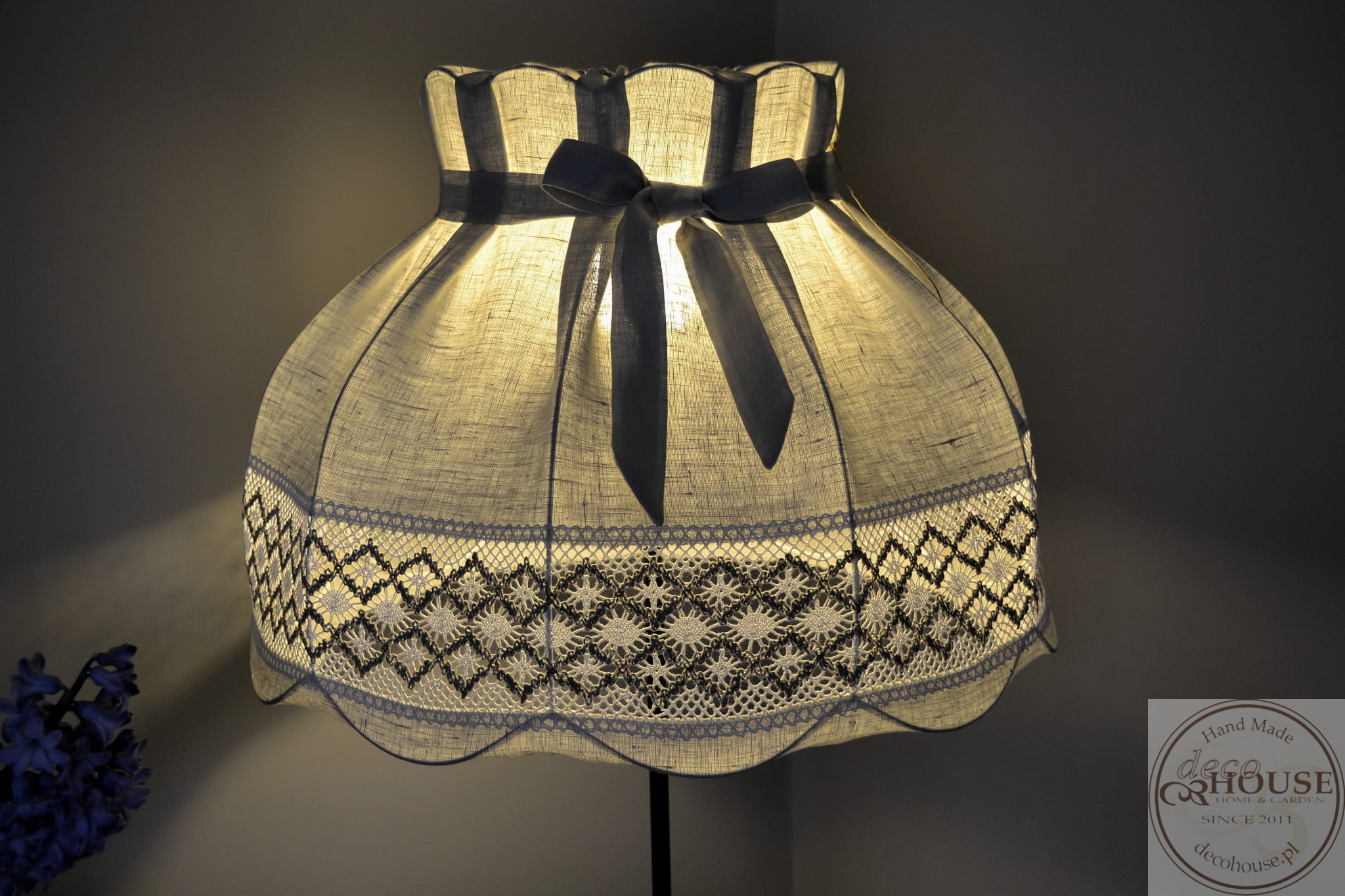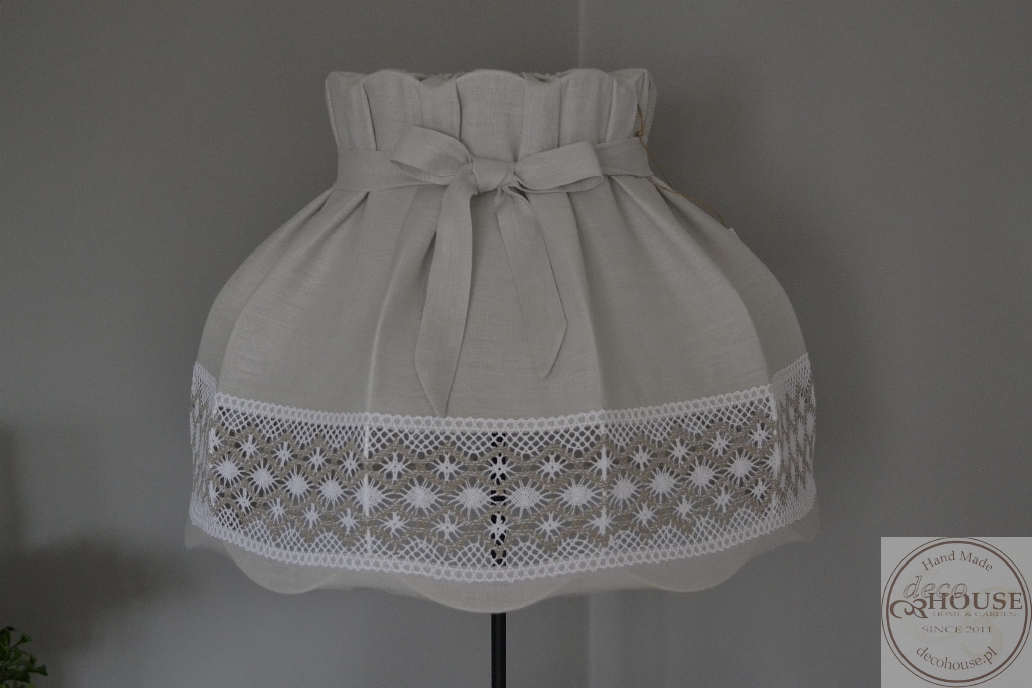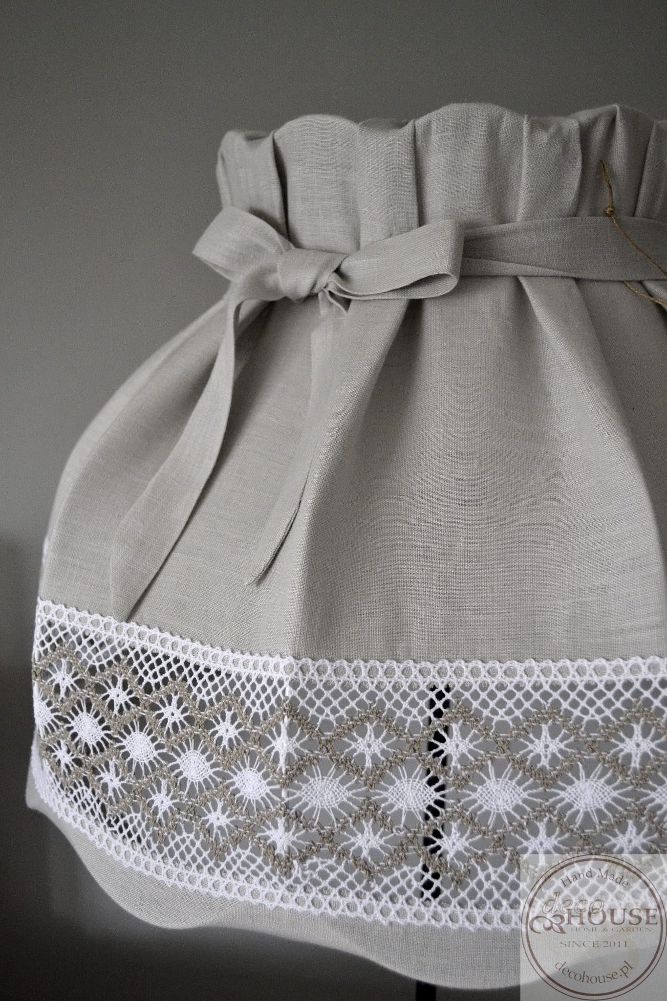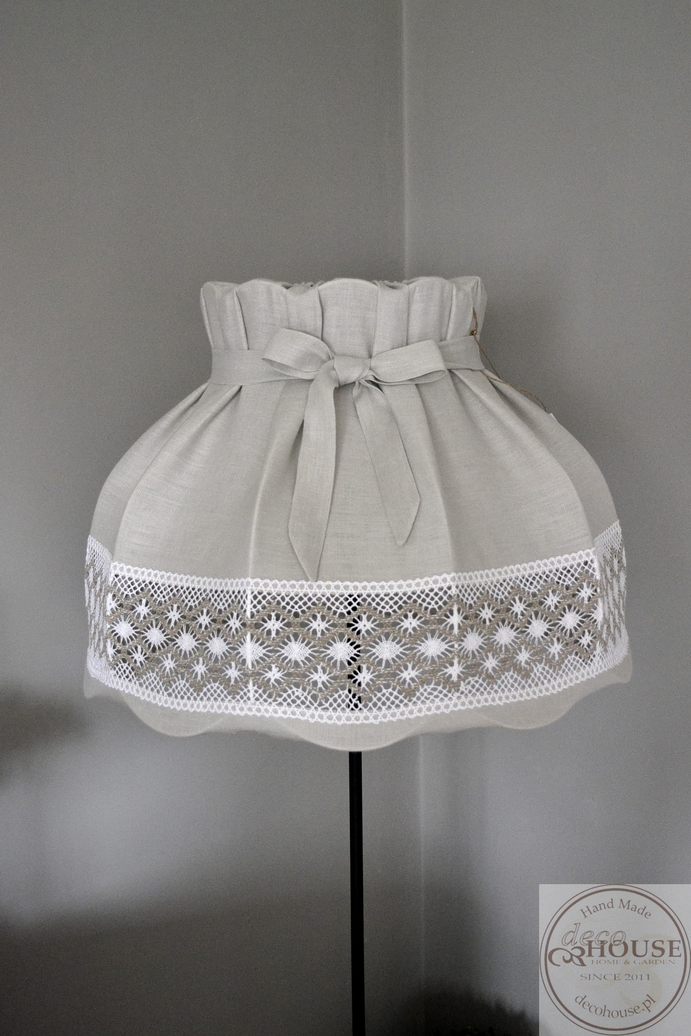 Abażur lniany szary z bawełnianą ozdobną koronką, z kokardką, górą i dołem na gumce, możliwość zdjęcia do prania.