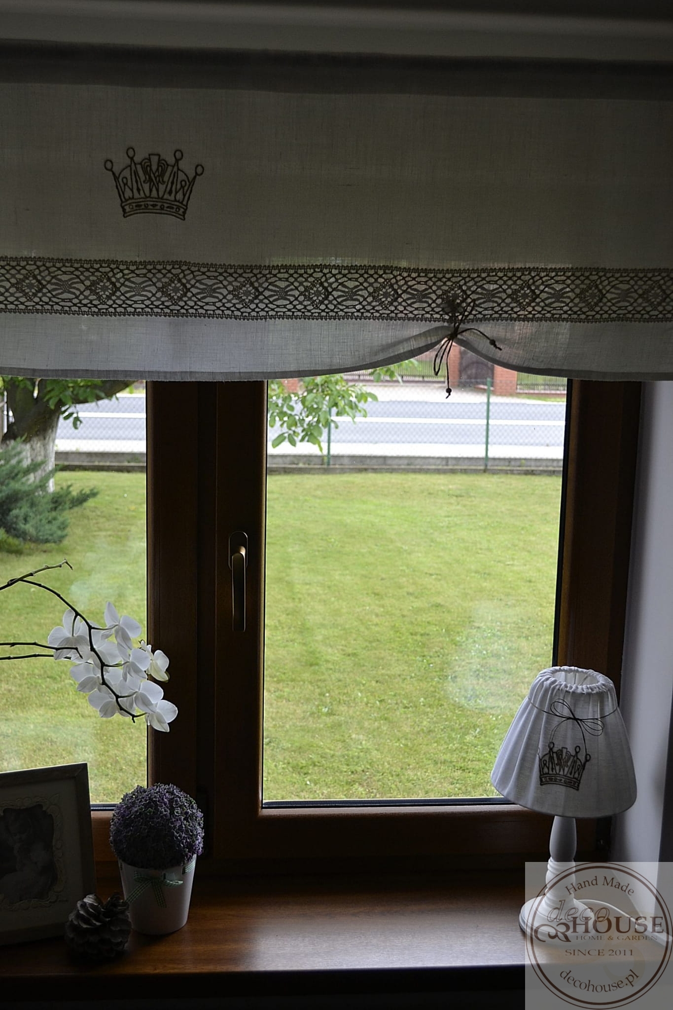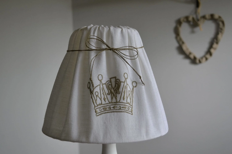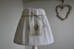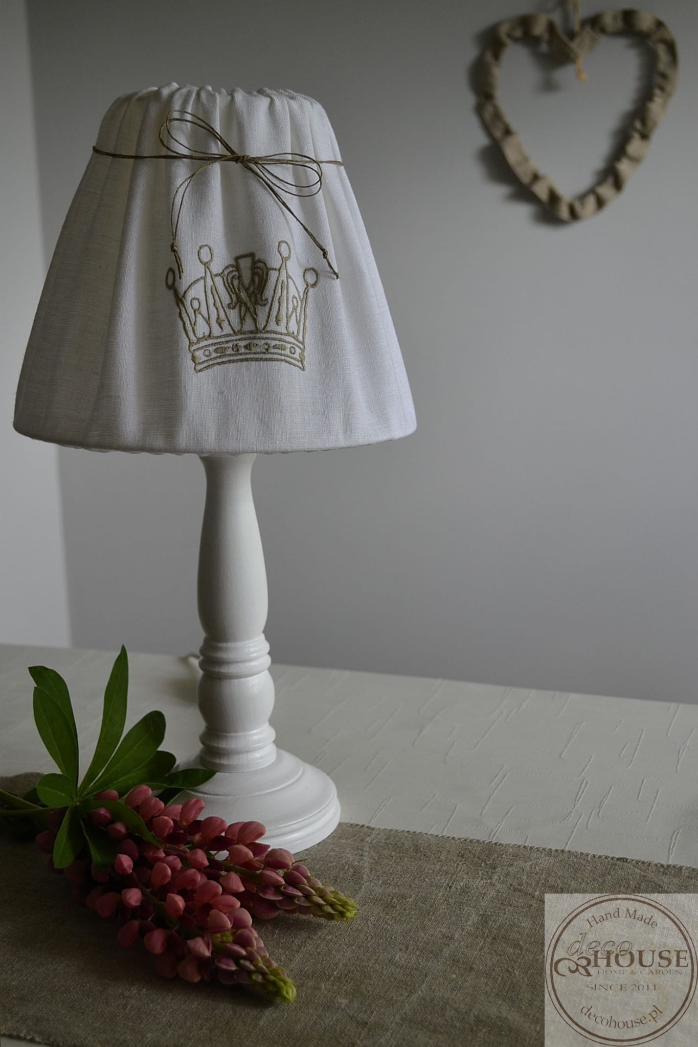 Abażur biały uszyty z lnu z haftem (korona), przewiązany sznureczkiem lnianym lub tasiemką bawełnianą, delikatnie marszczony , na górze i dole na gumce co umożliwia łatwe zdjęcie i możliwość uprania.