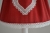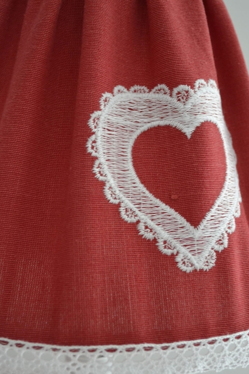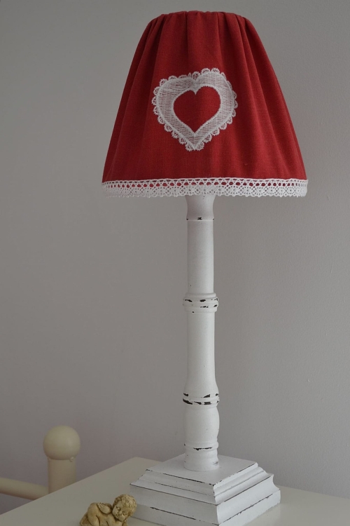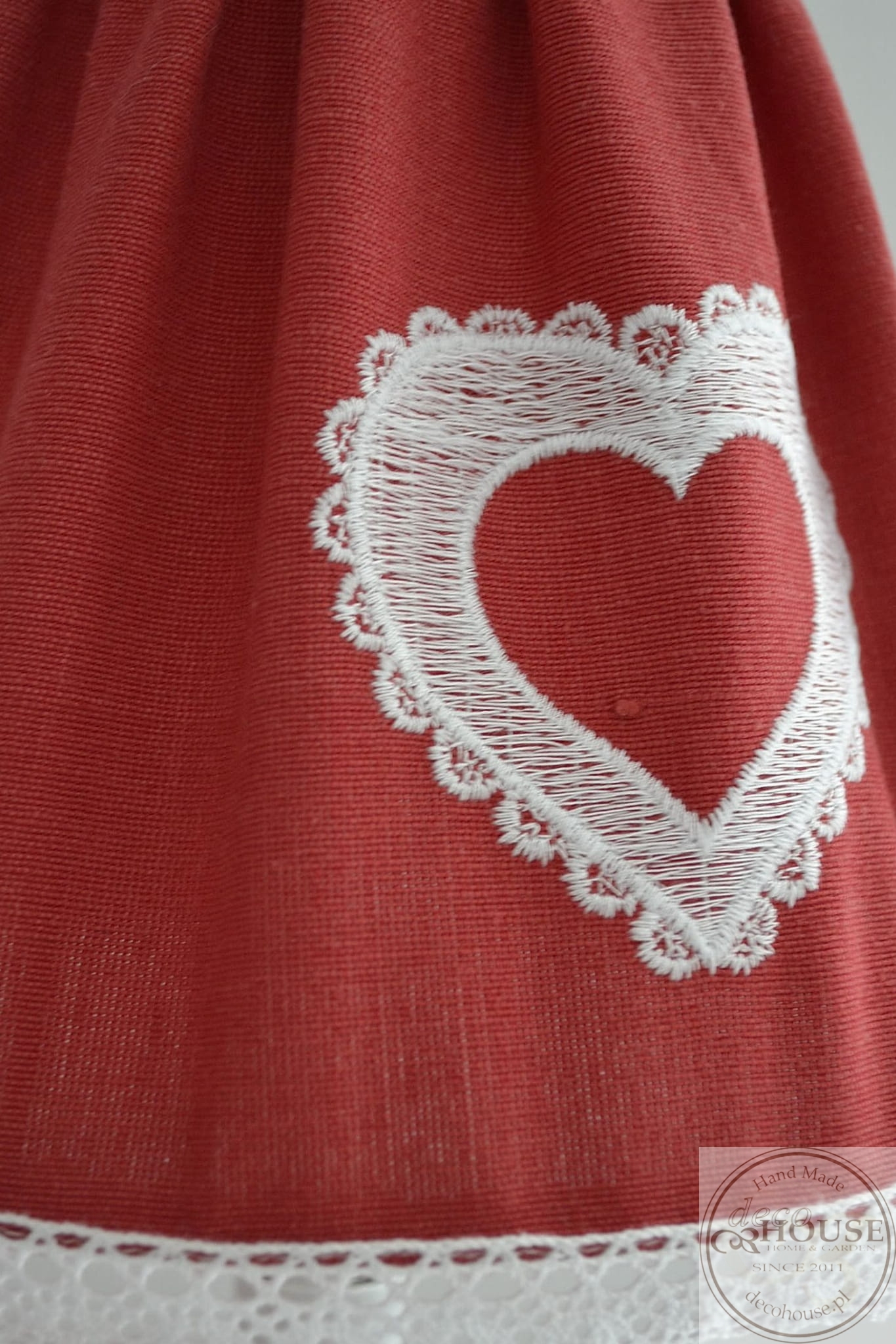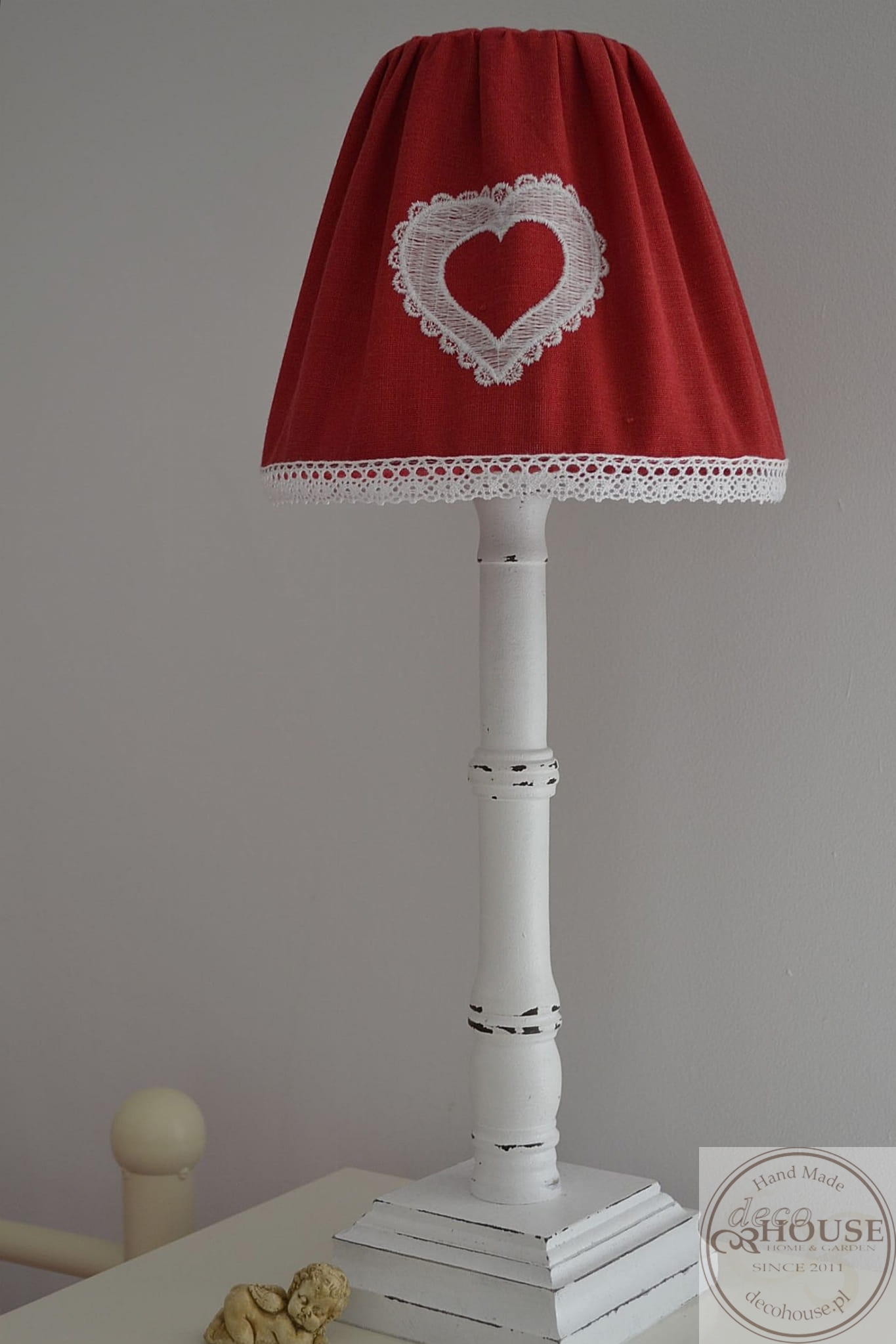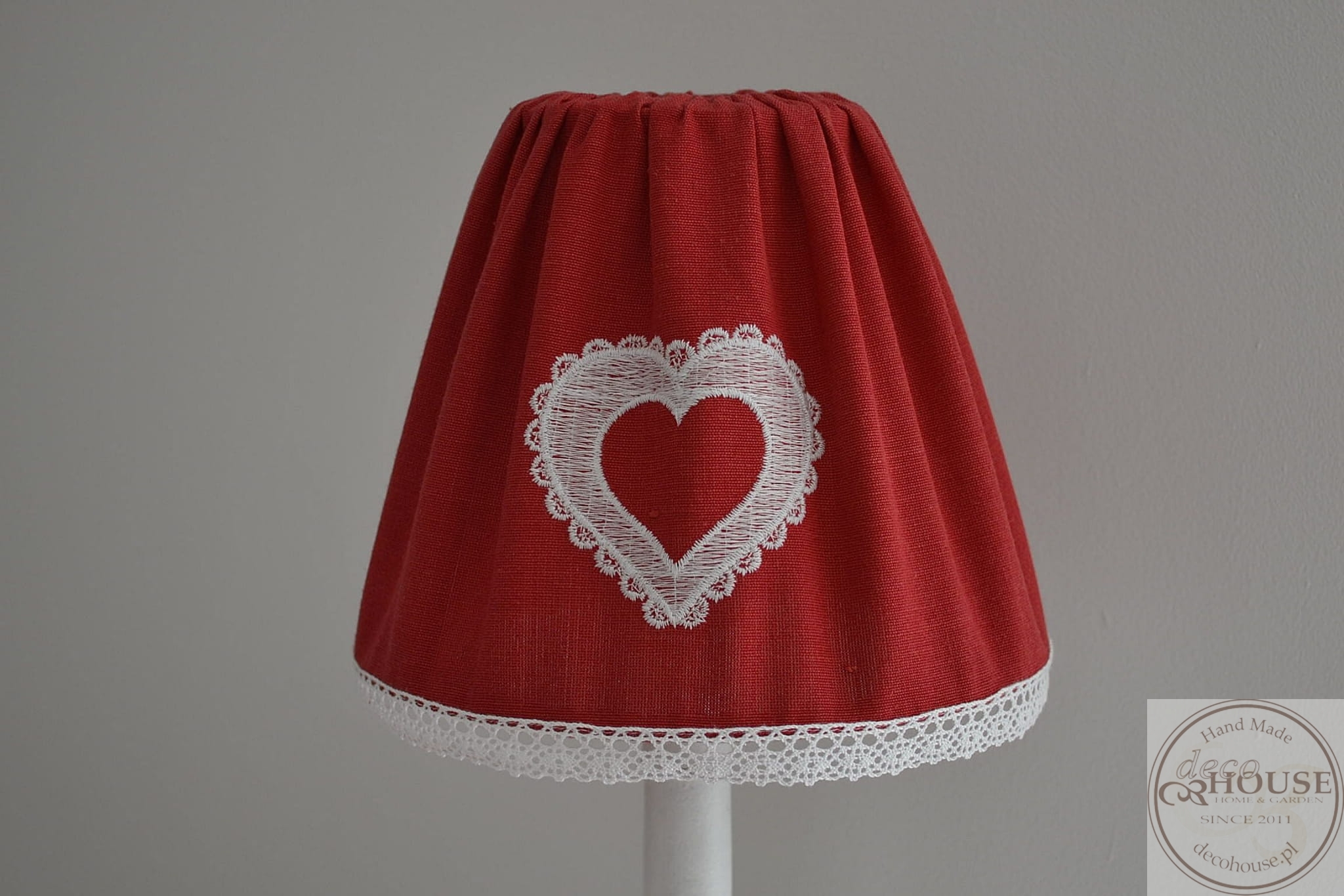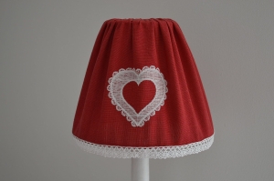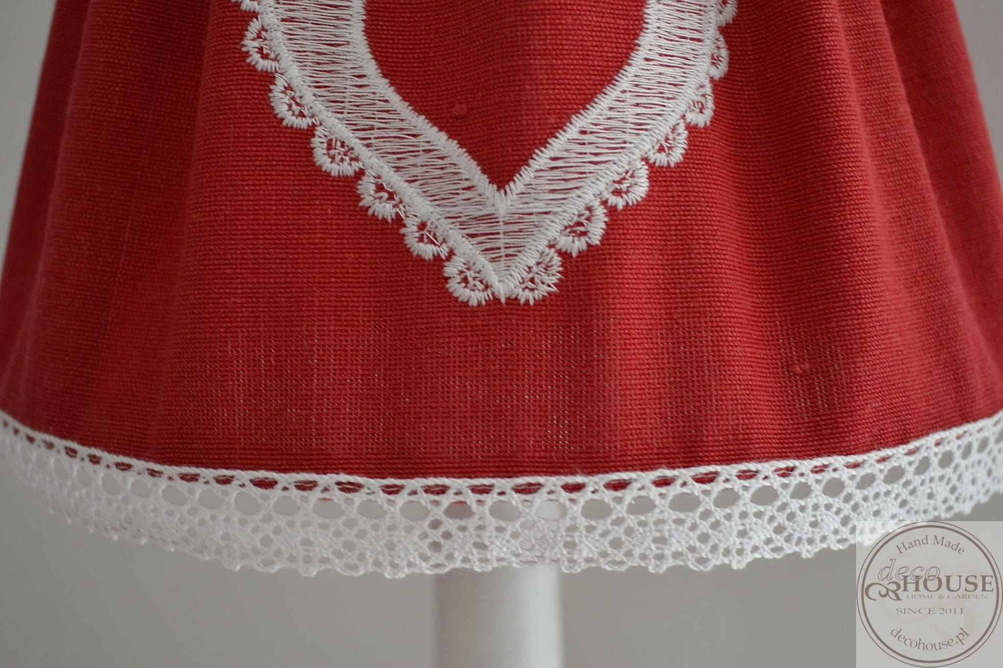 Abażur czerwony uszyty z bawełny z haftem serduszko i u dołu ozdobna bawełniana koronka, delikatnie marszczony , na górze i dole na gumce co umożliwia łatwe zdjęcie i możliwość uprania.