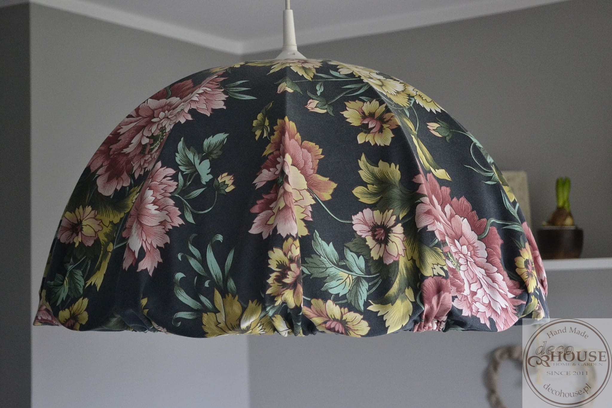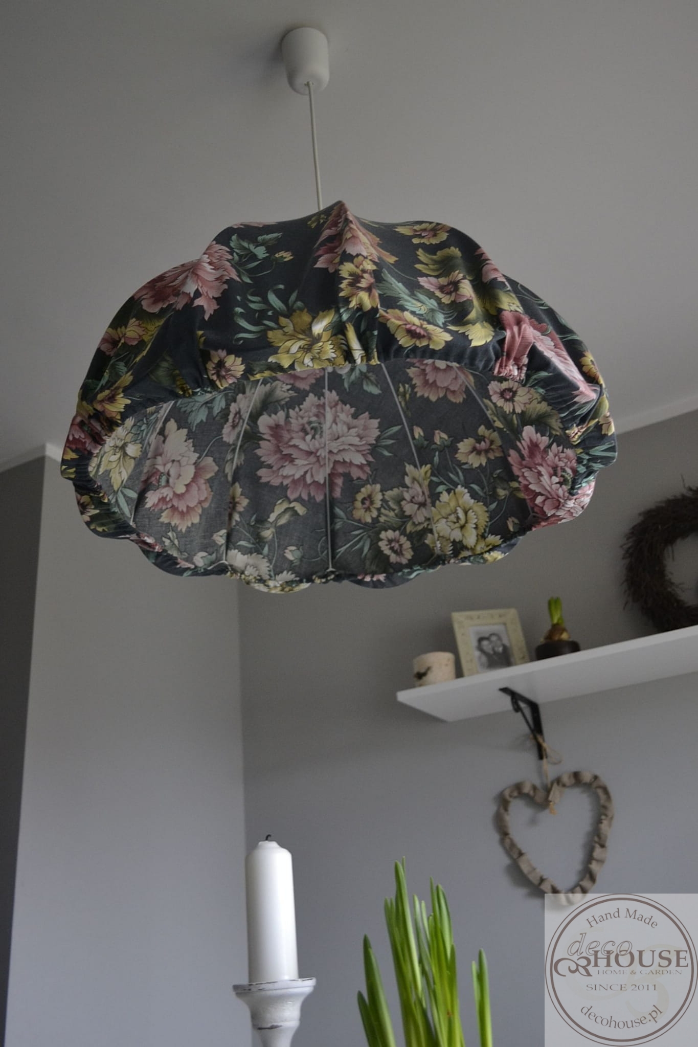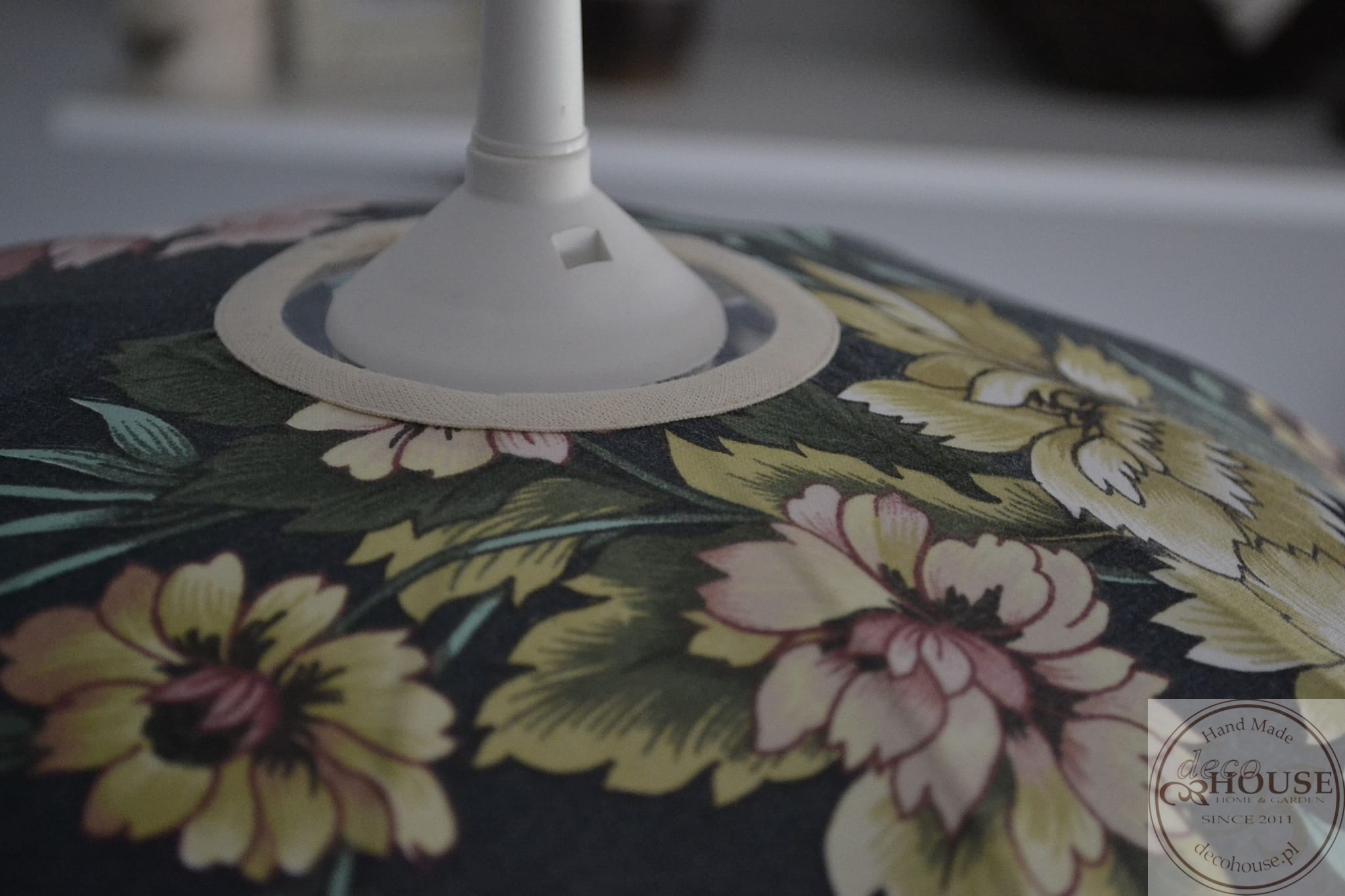 Abażur z tkaniny bawełnianej recyklingowej w kwiaty, kształt abażuru półkulisty ,typu parasol, dołem na gumce, możliwość zdjęcia do prania.