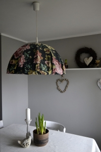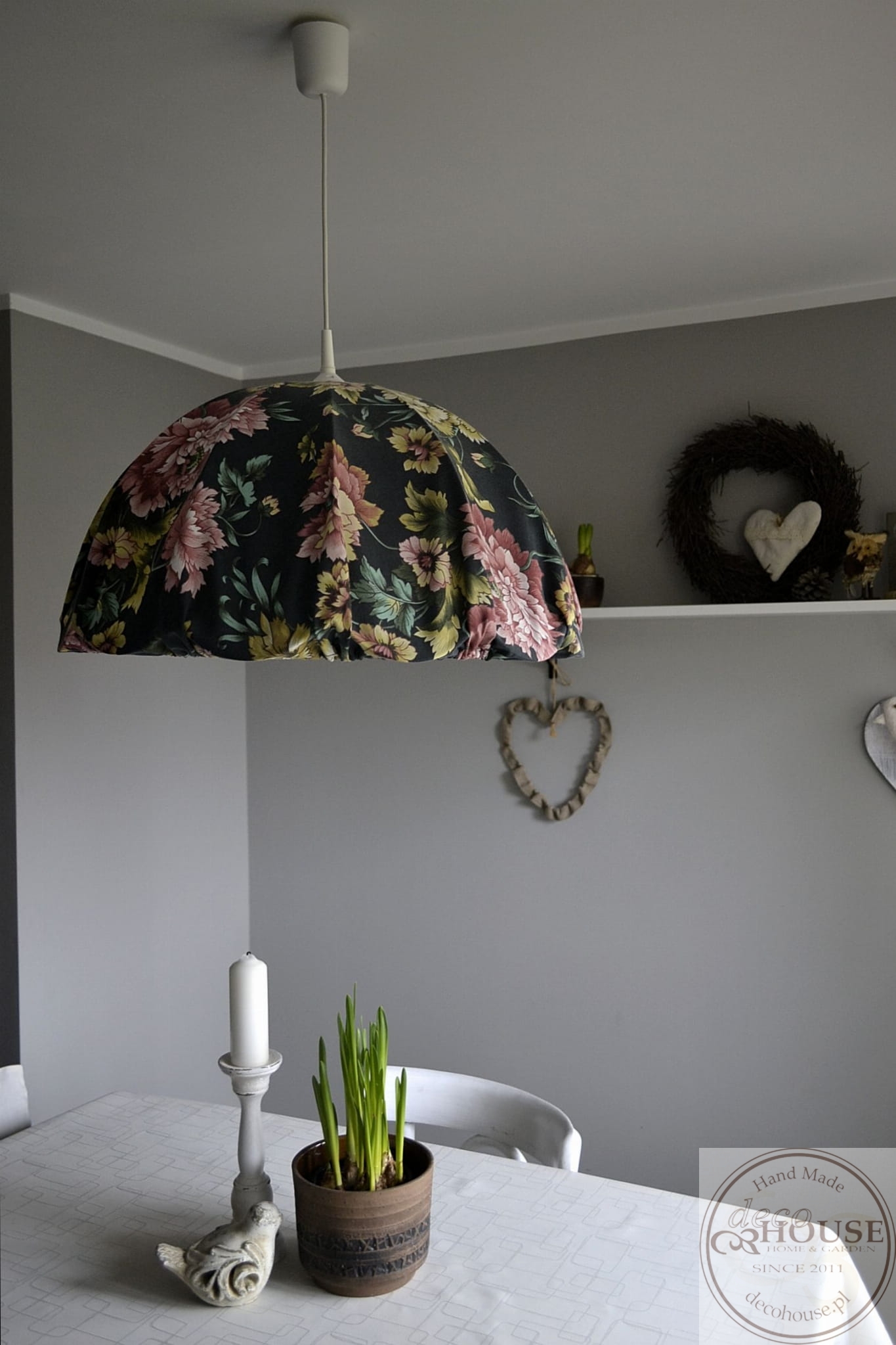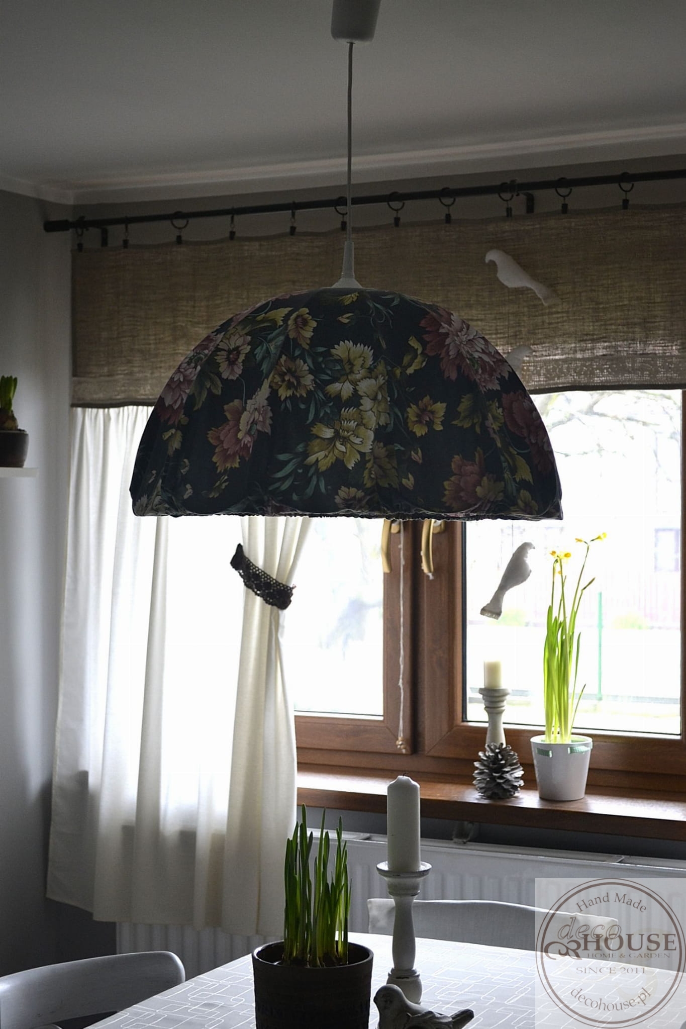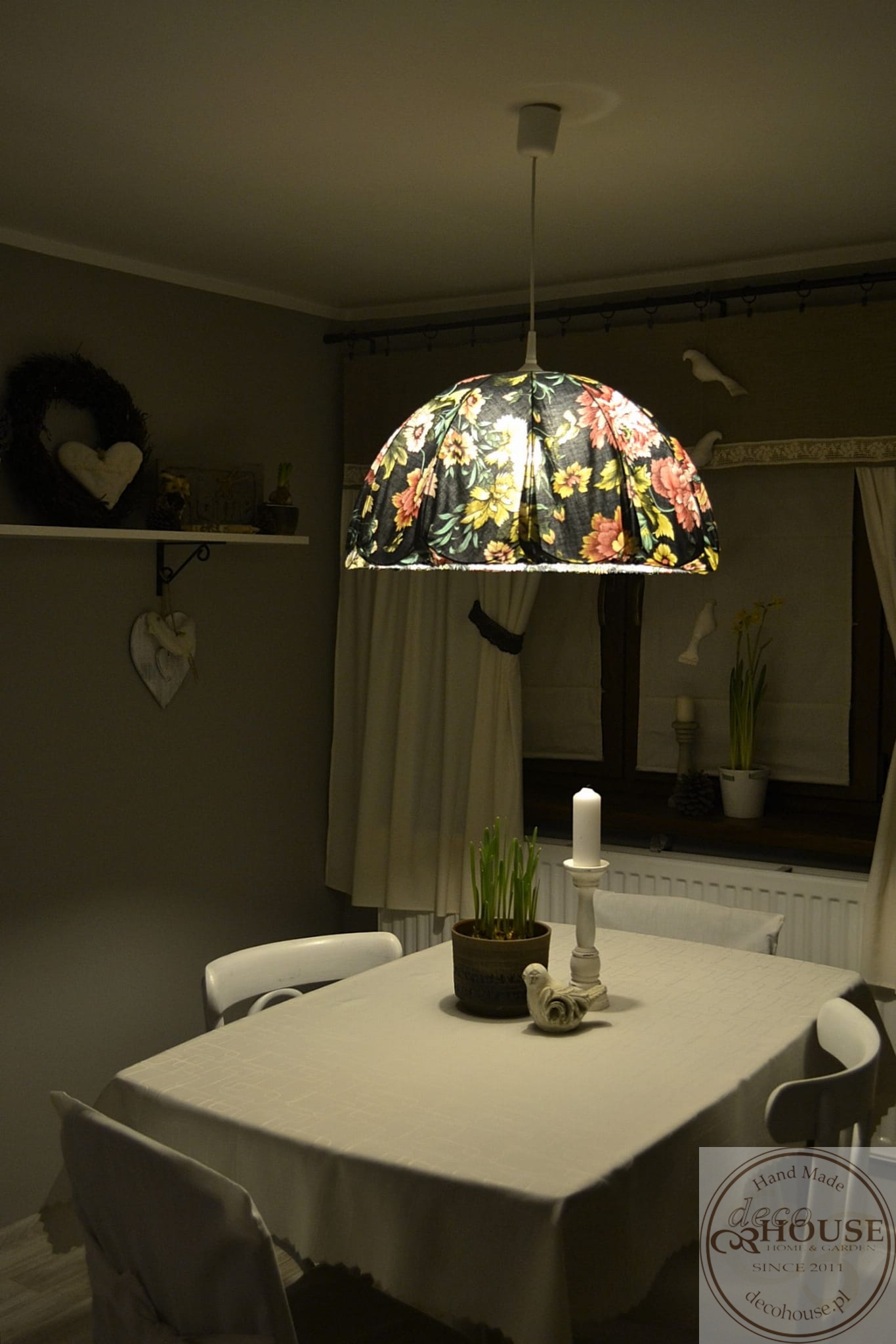 Abażur z tkaniny bawełnianej recyklingowej w kwiaty, kształt abażuru półkulisty ,typu parasol, dołem na gumce, możliwość zdjęcia do prania.