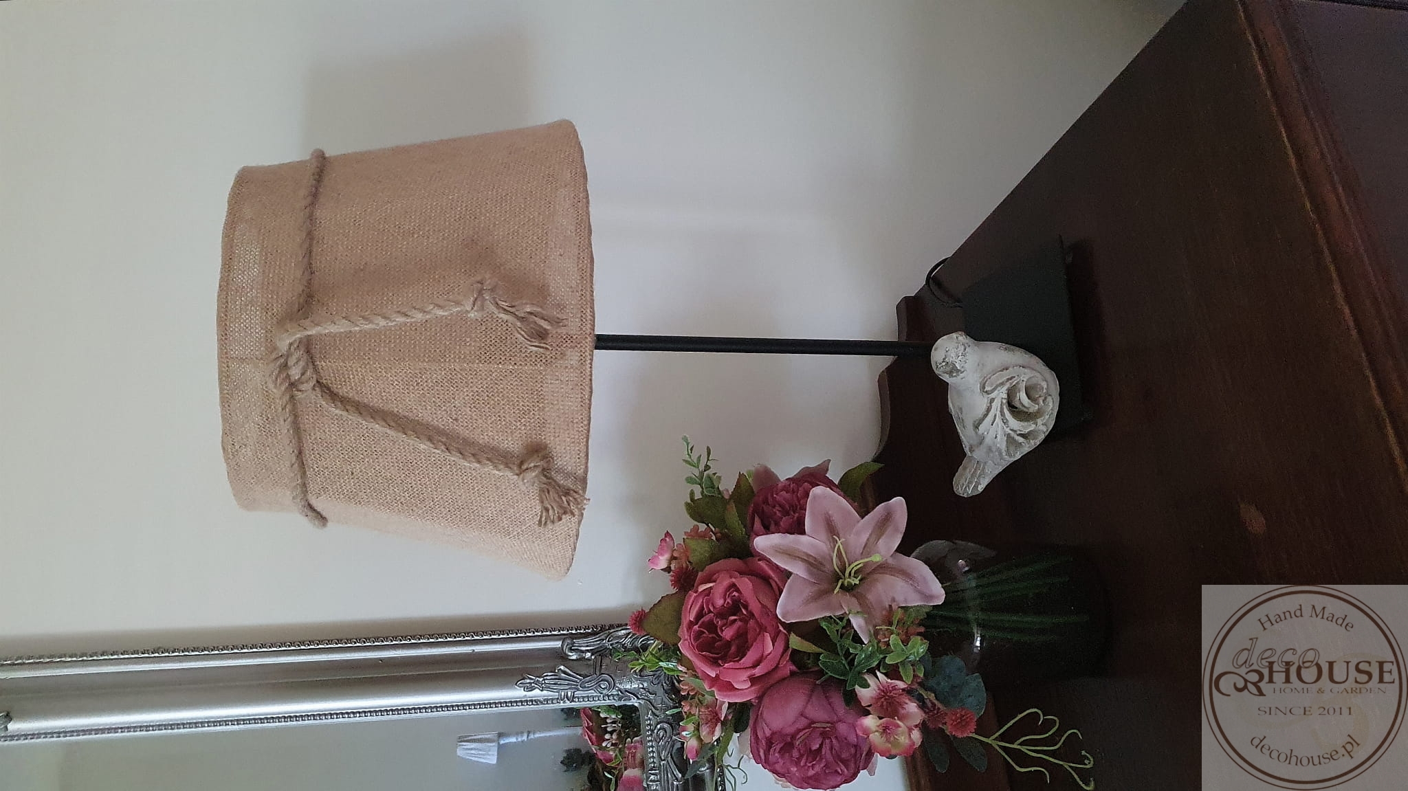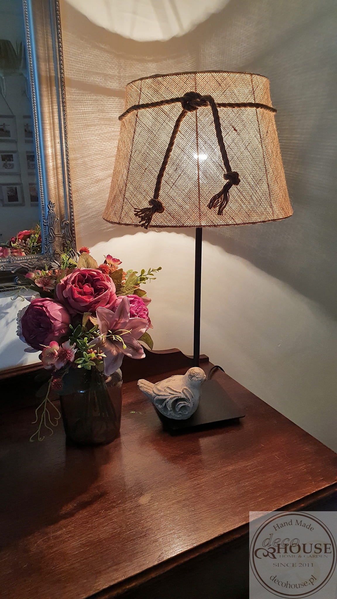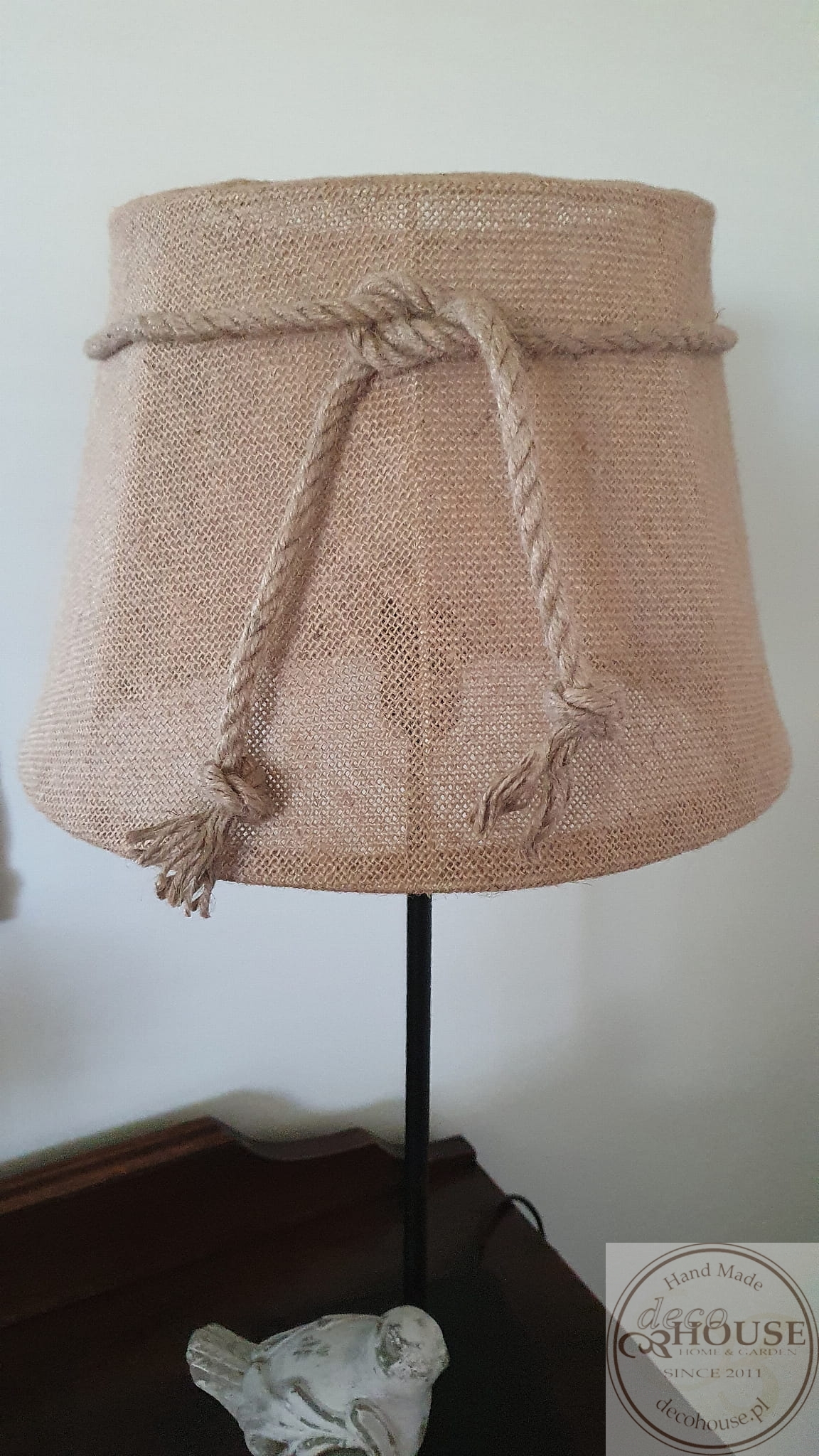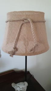 Abażur z juty przewiązany sznurem jutowym.