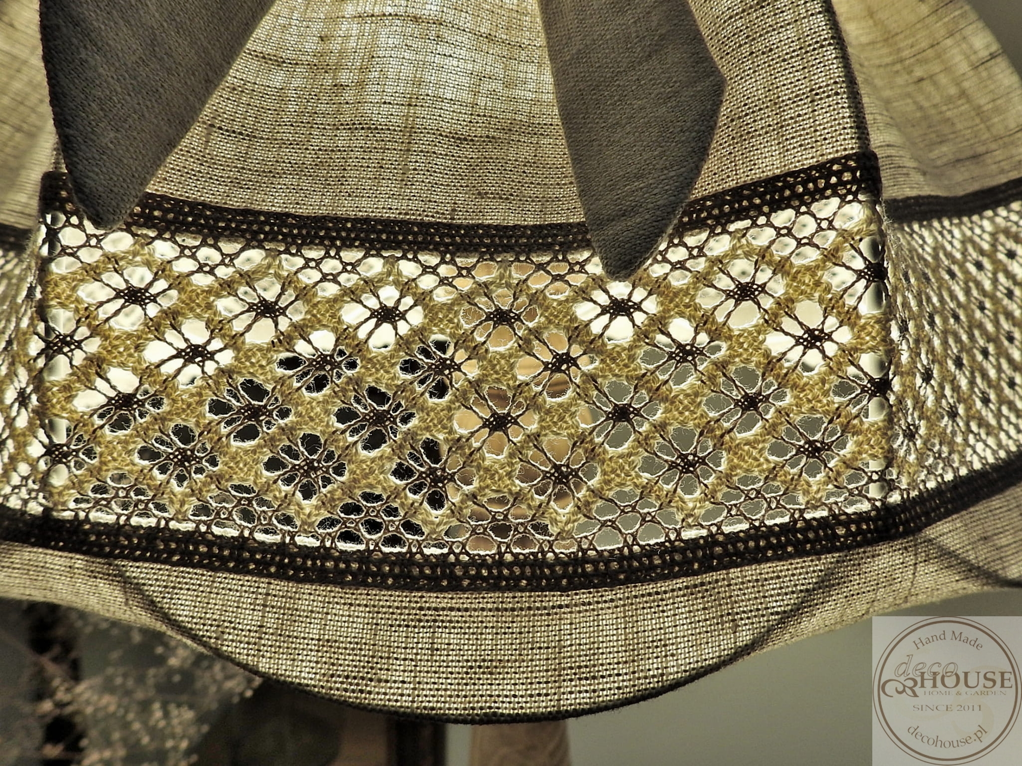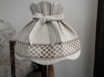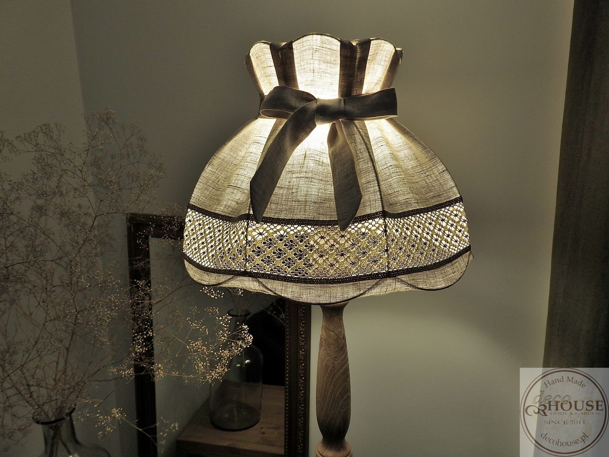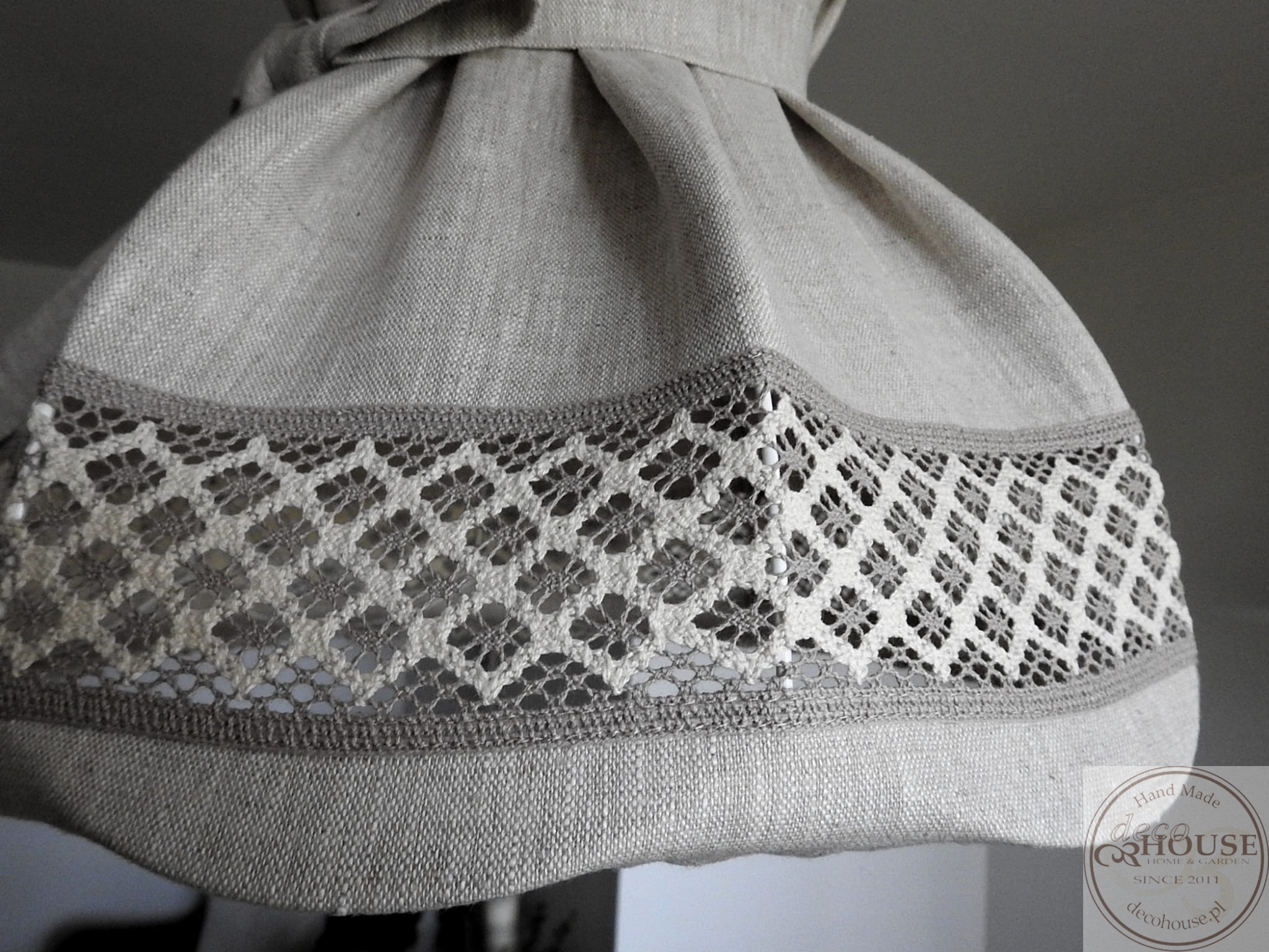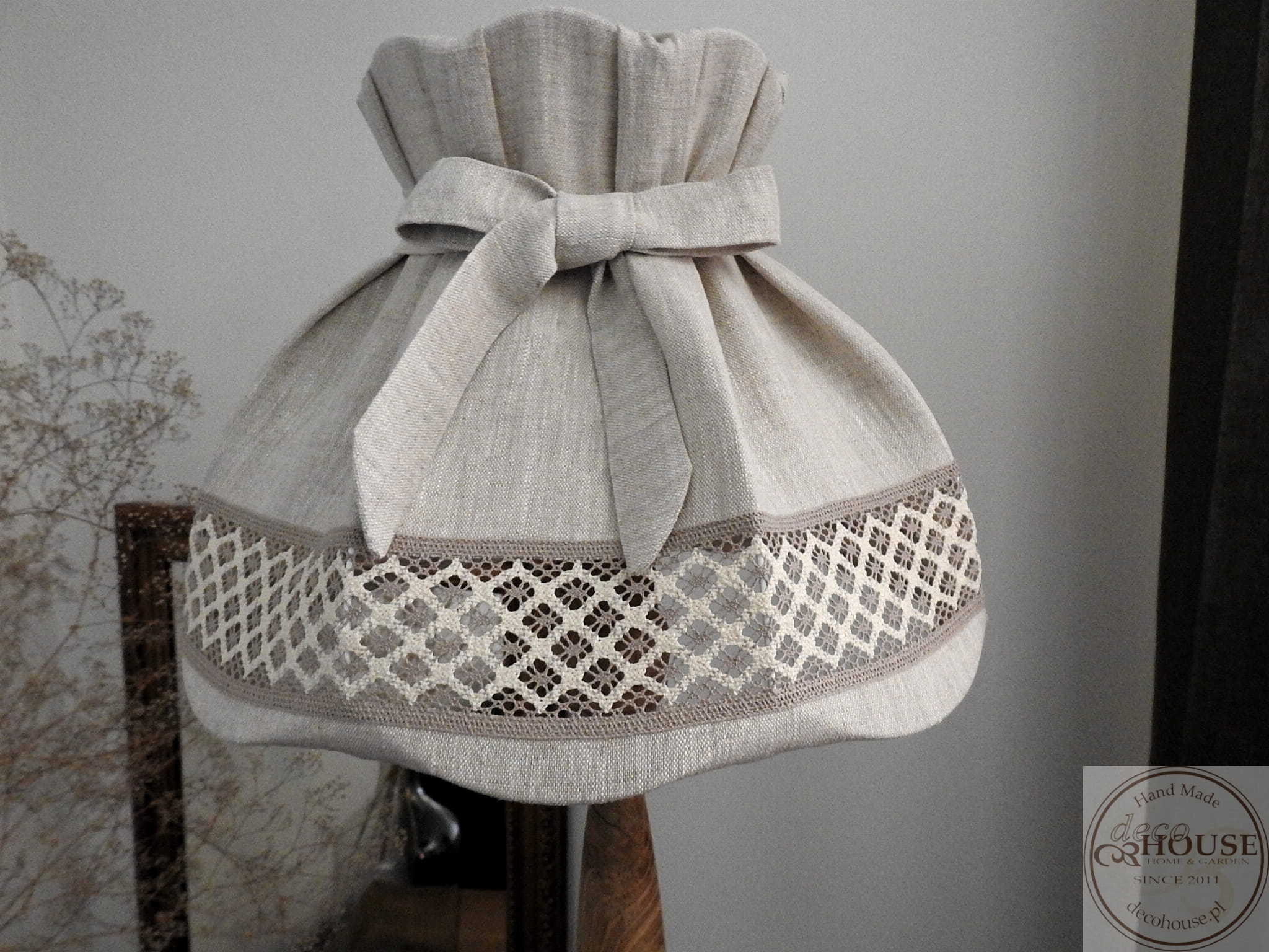 Abażur z lnu z ozdobną koronką, z kokardką, górą i dołem na gumce, możliwość zdjęcia do prania.