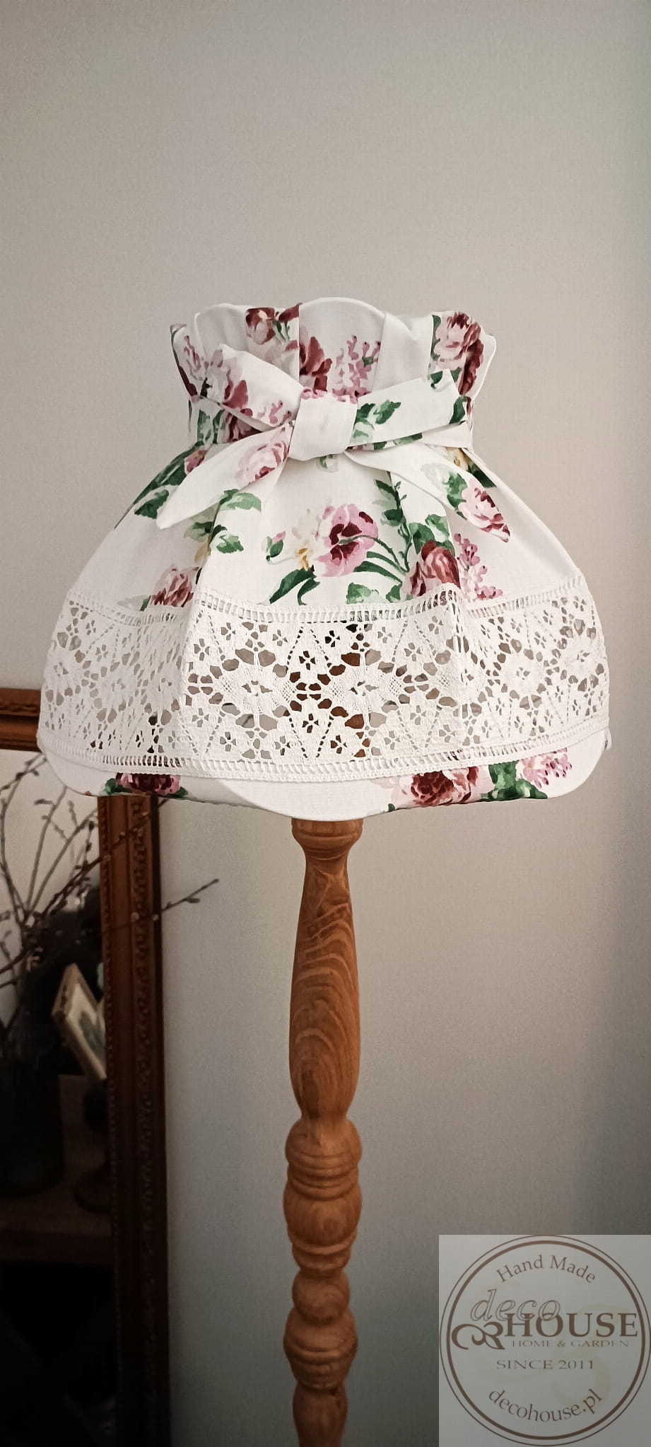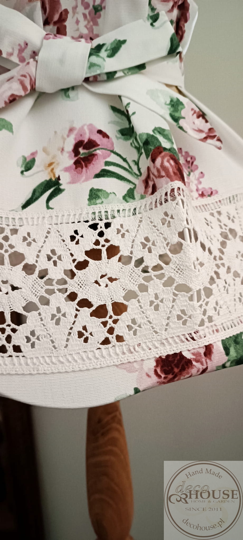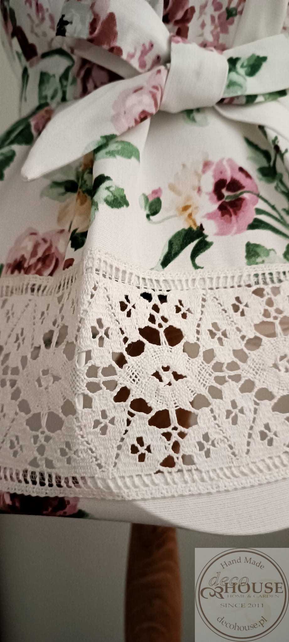 Abażur z tkaniny bawełnianej w róże z ozdobną koronką i kokardą.