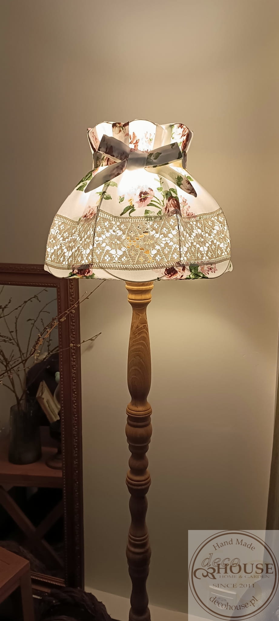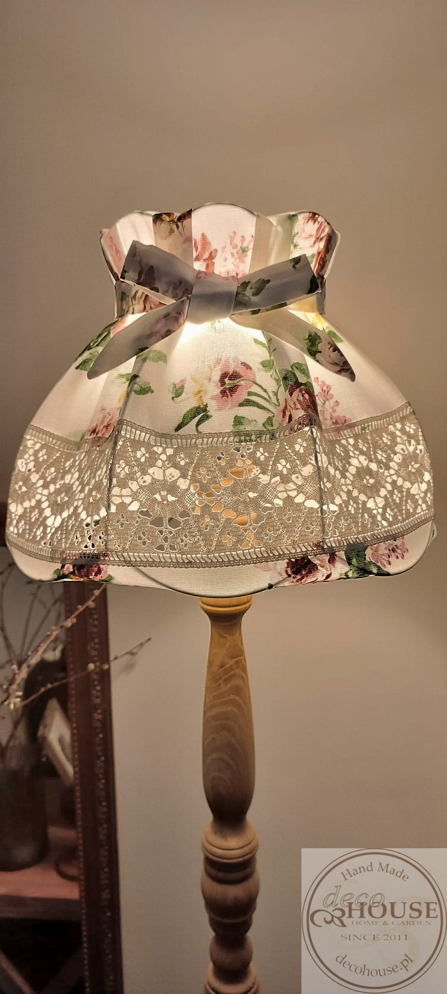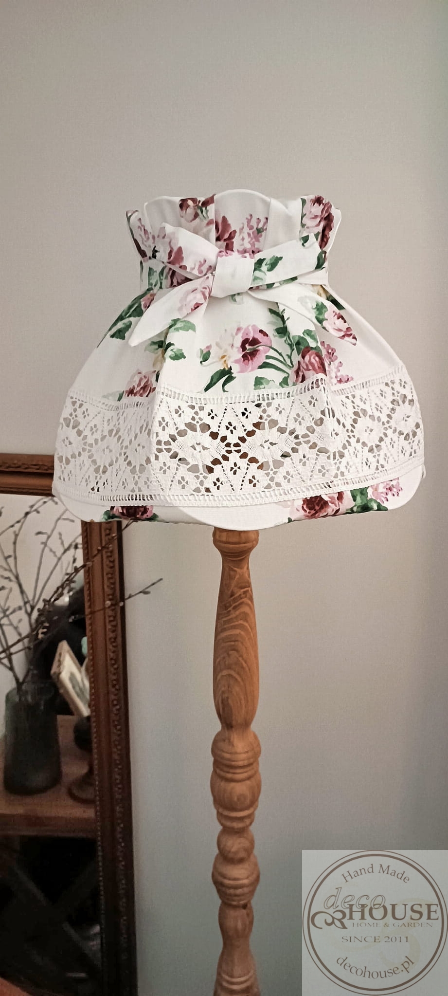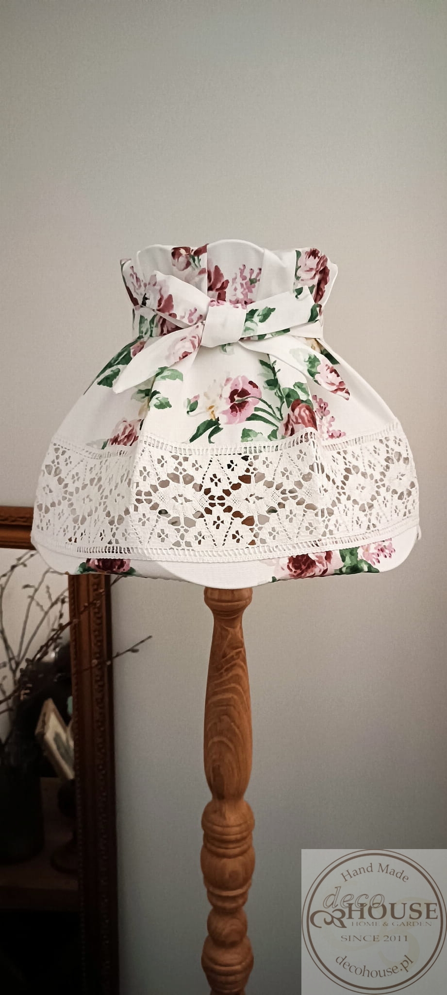 Abażur z tkaniny bawełnianej w róże z ozdobną koronką i kokardą.