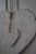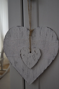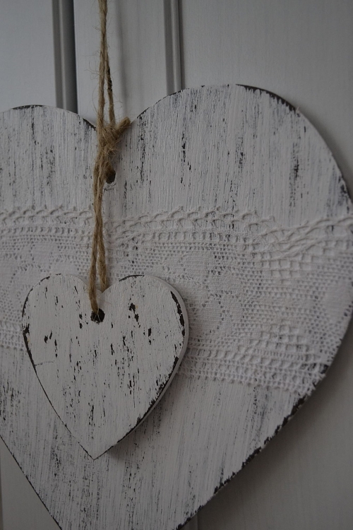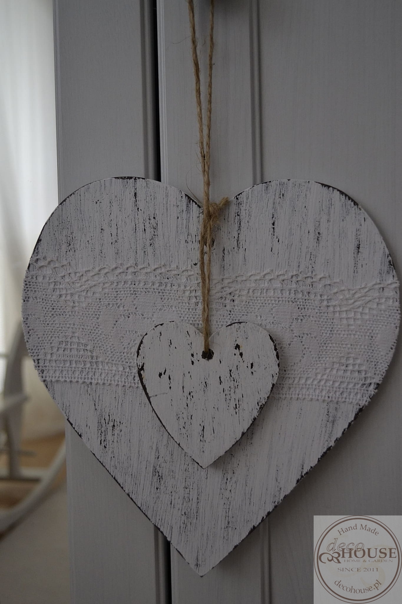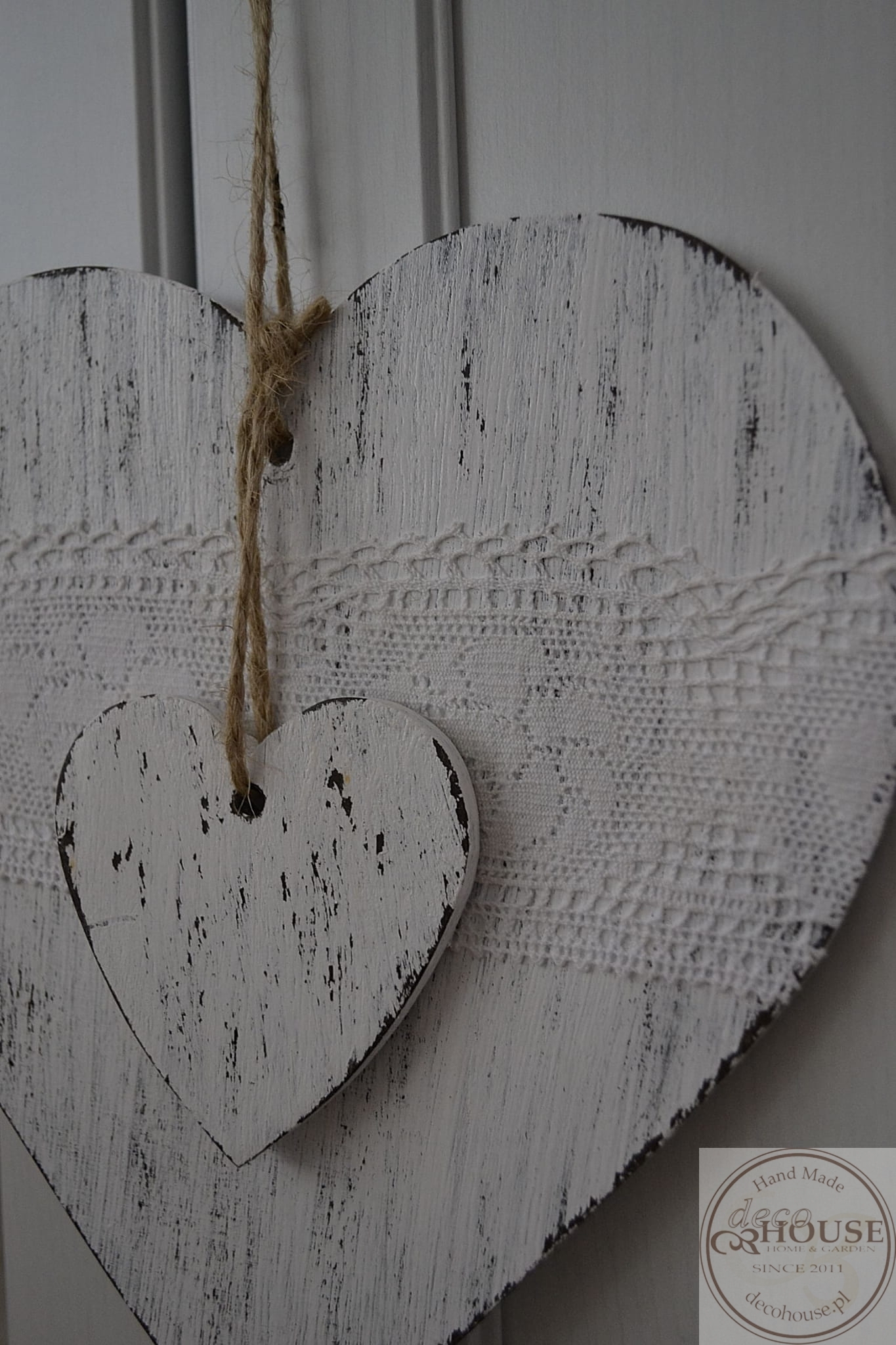 Duże drewniane serce bielone, postarzane z dekoracyjną koronką i małe serduszko na lnianym sznurku .