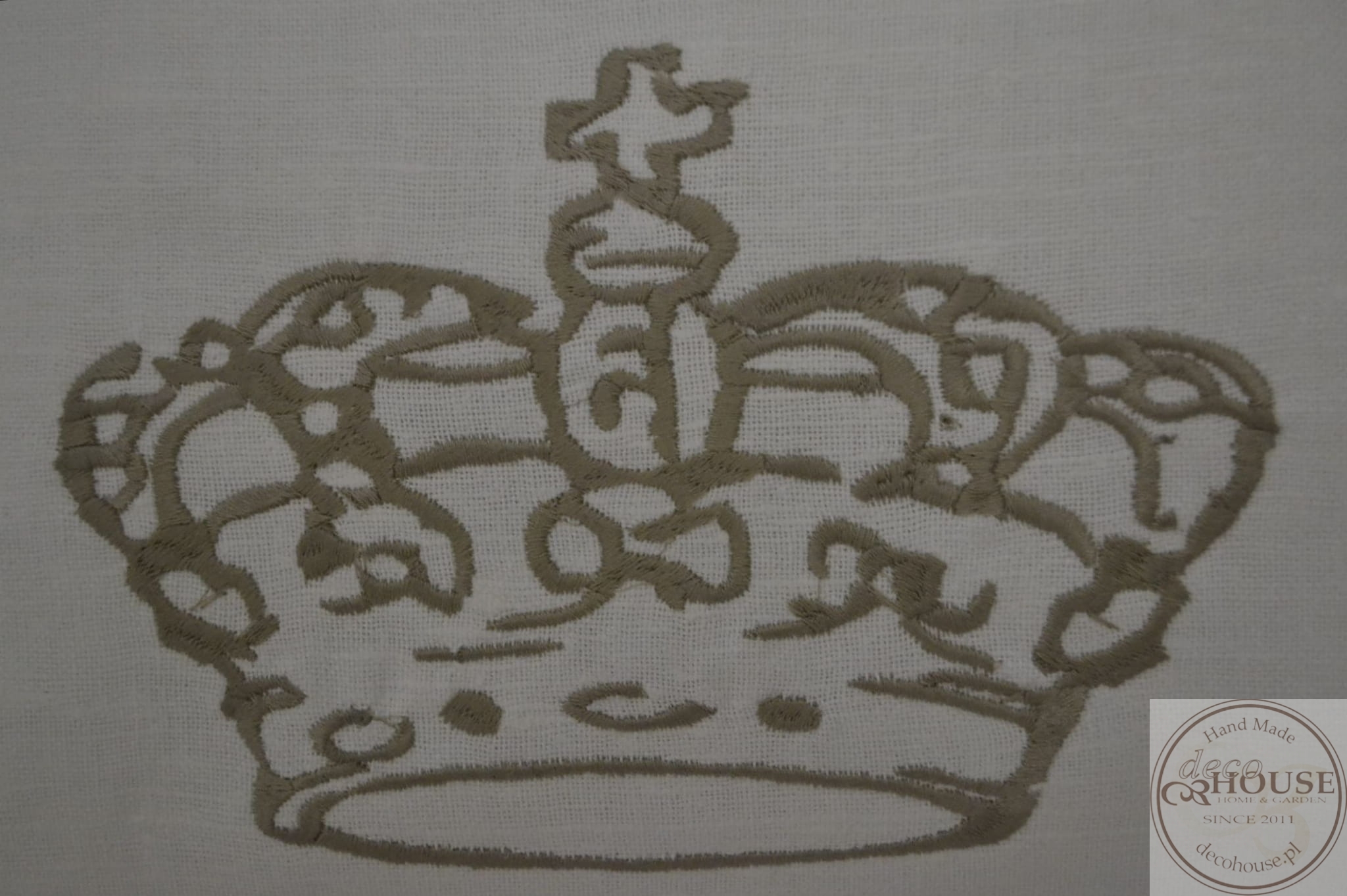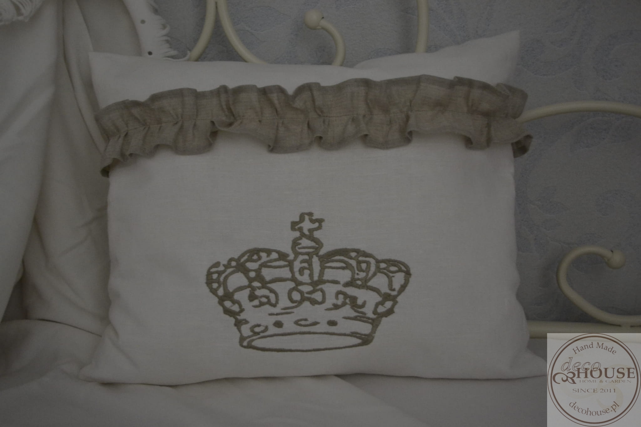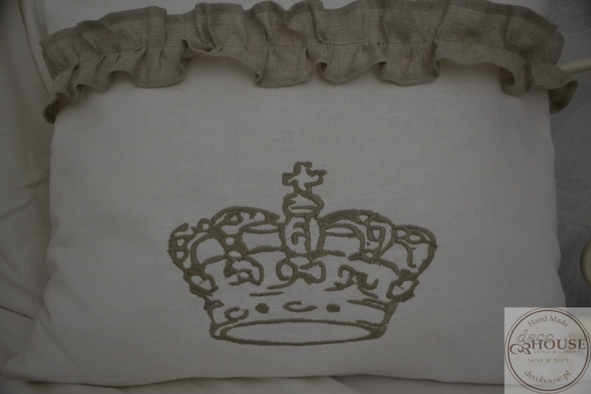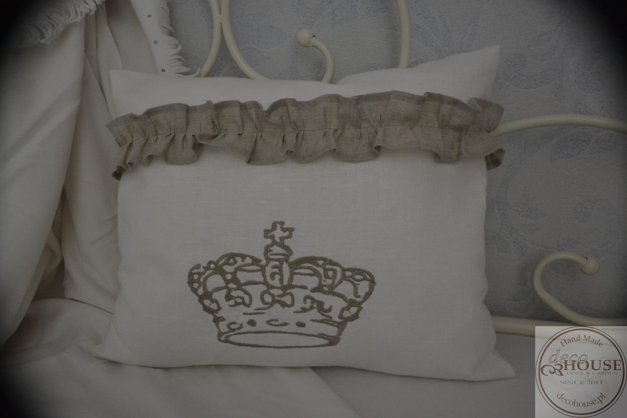 Poszewka uszyta z lnu z ozdobnym haftem korona i falbanką, w tyle zapinana na dwa drewniane guziki. Poszewka ozdobi każde wnętrze.