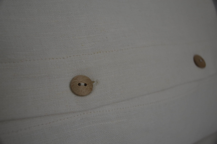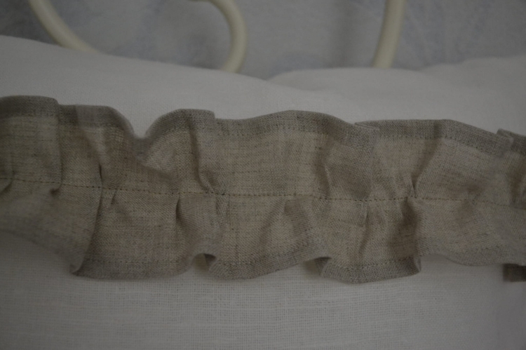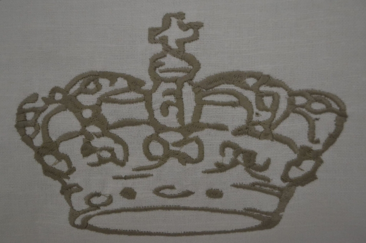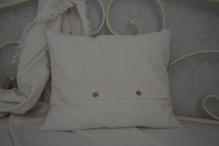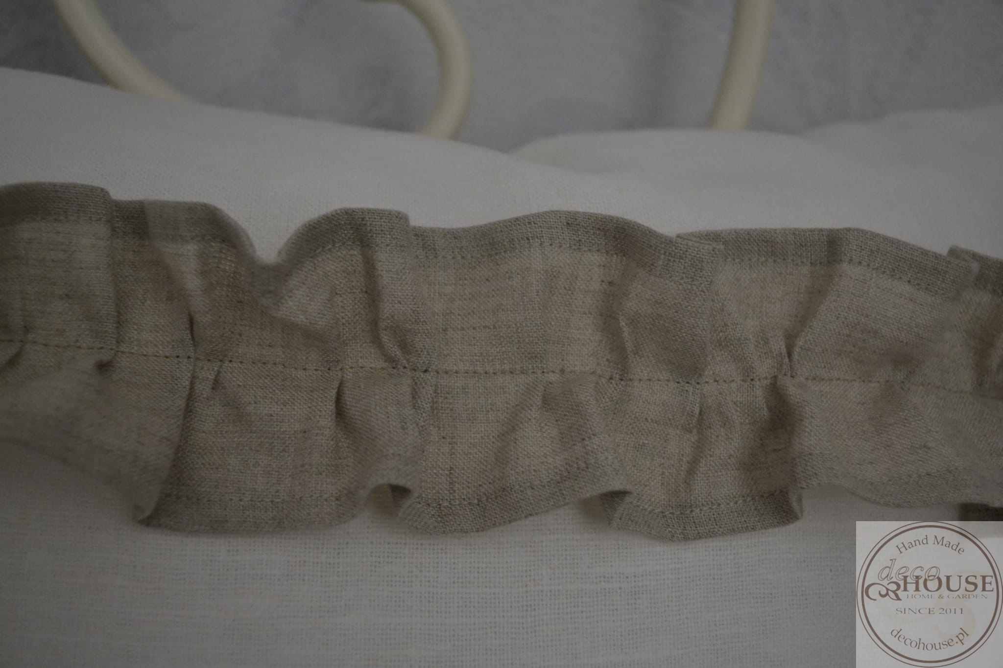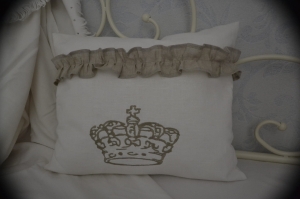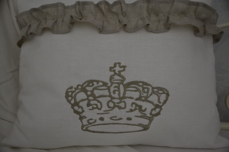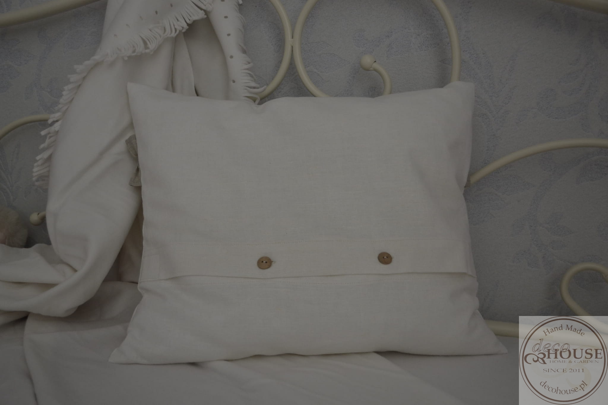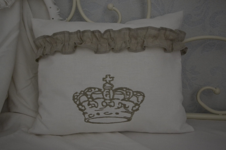 Poszewka uszyta z lnu z ozdobnym haftem korona i falbanką, w tyle zapinana na dwa drewniane guziki. Poszewka ozdobi każde wnętrze.