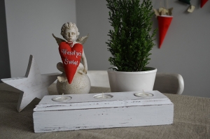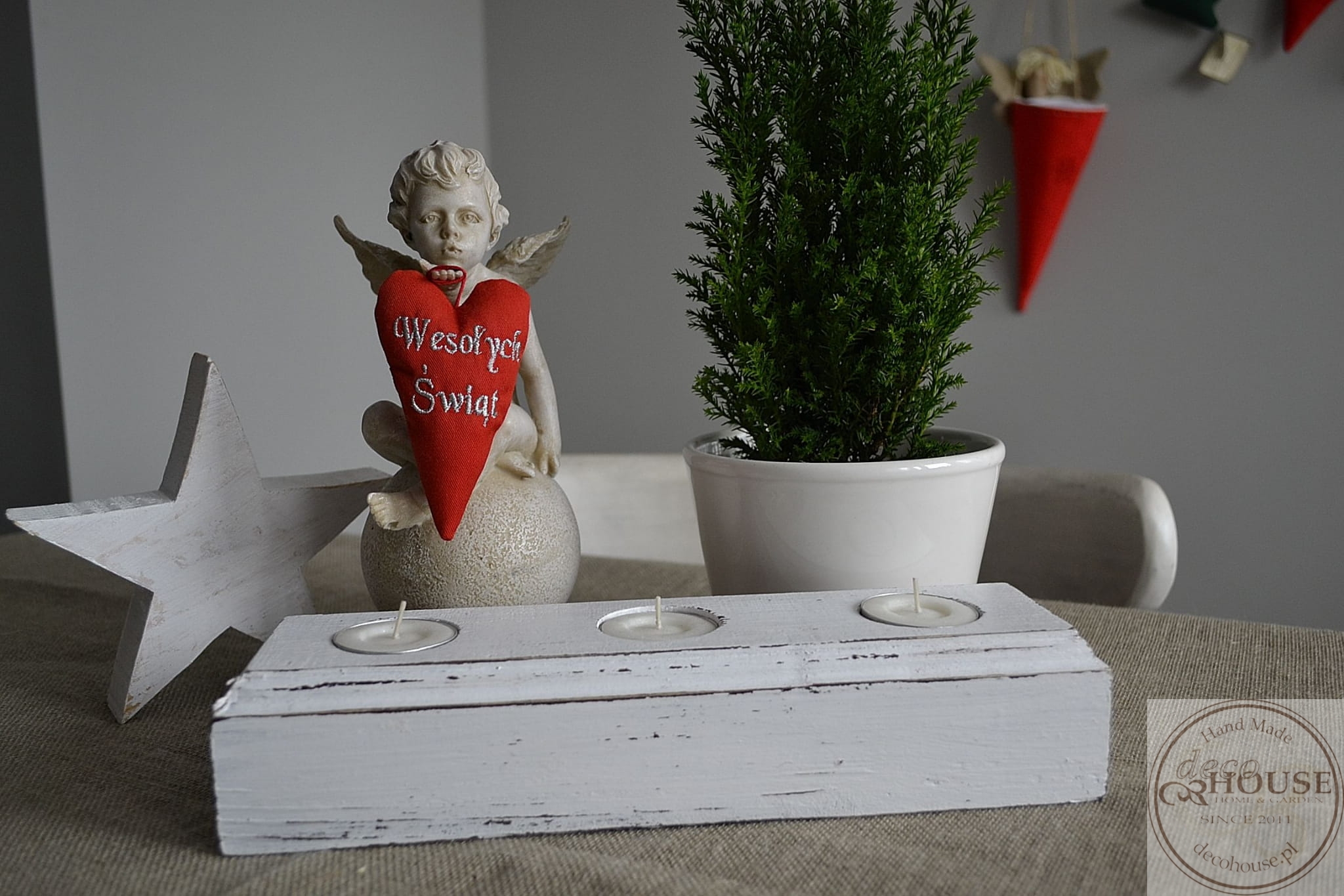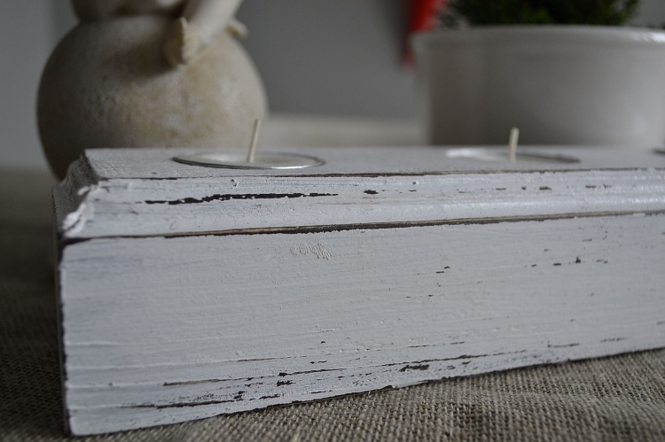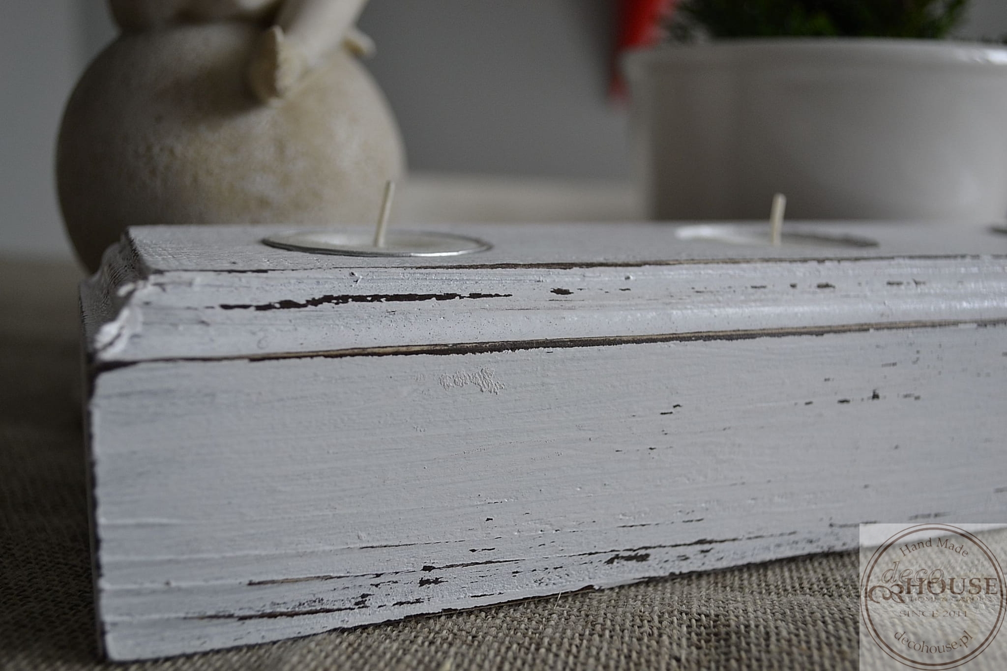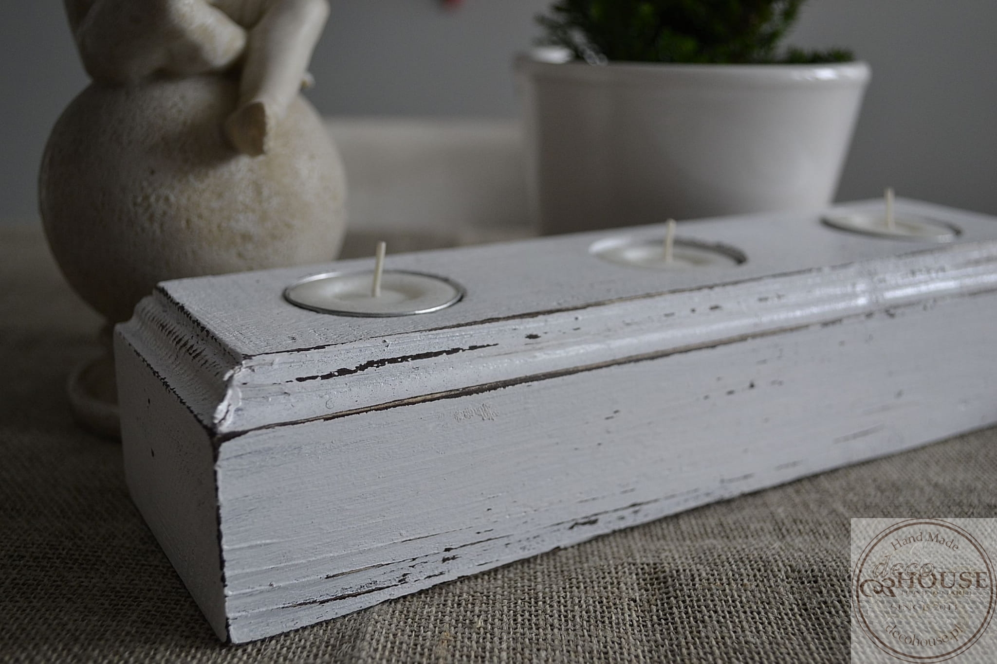 Świecznik drewniany pobielany, przecierany i postarzany na 3 tilajty.