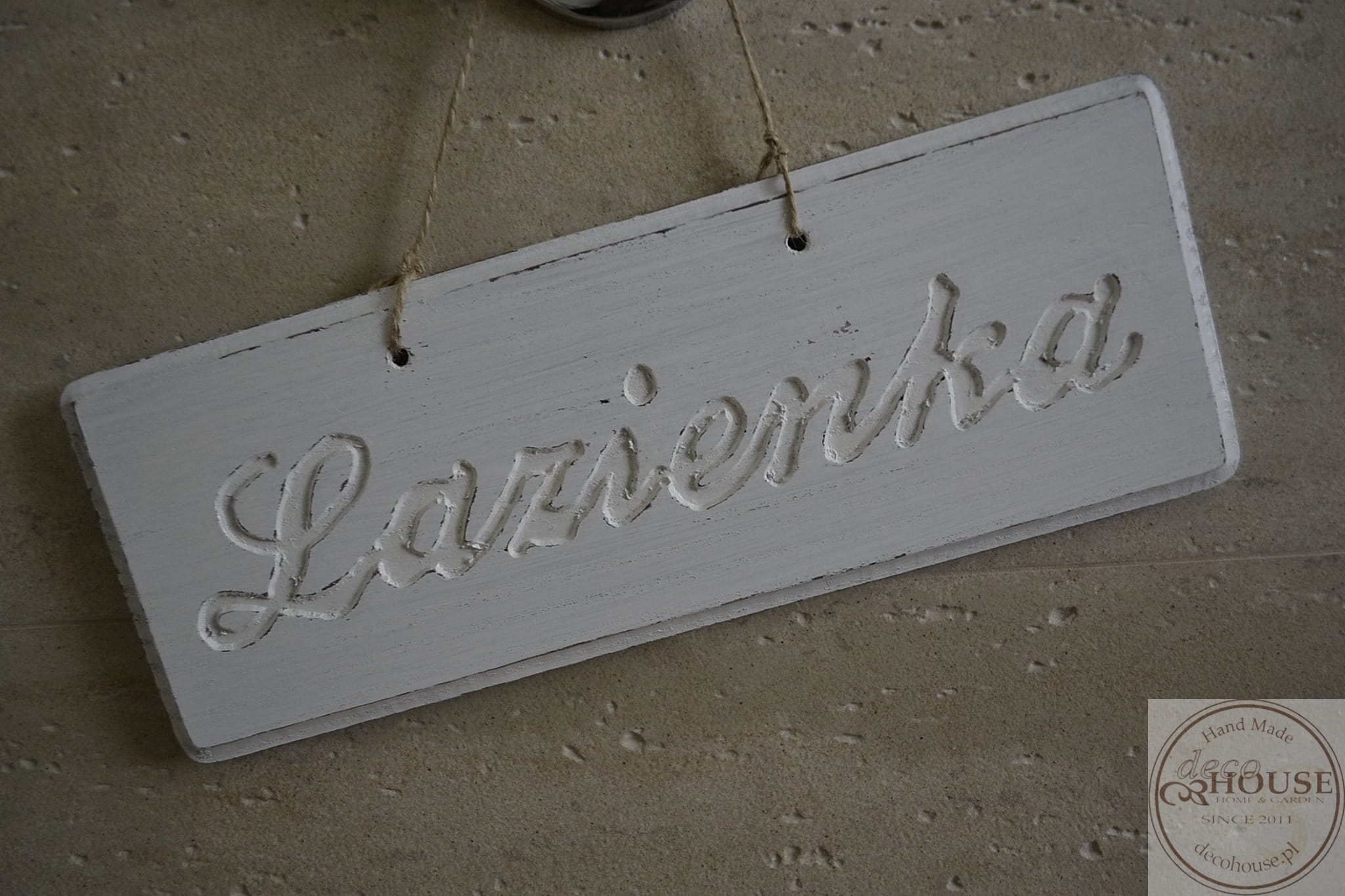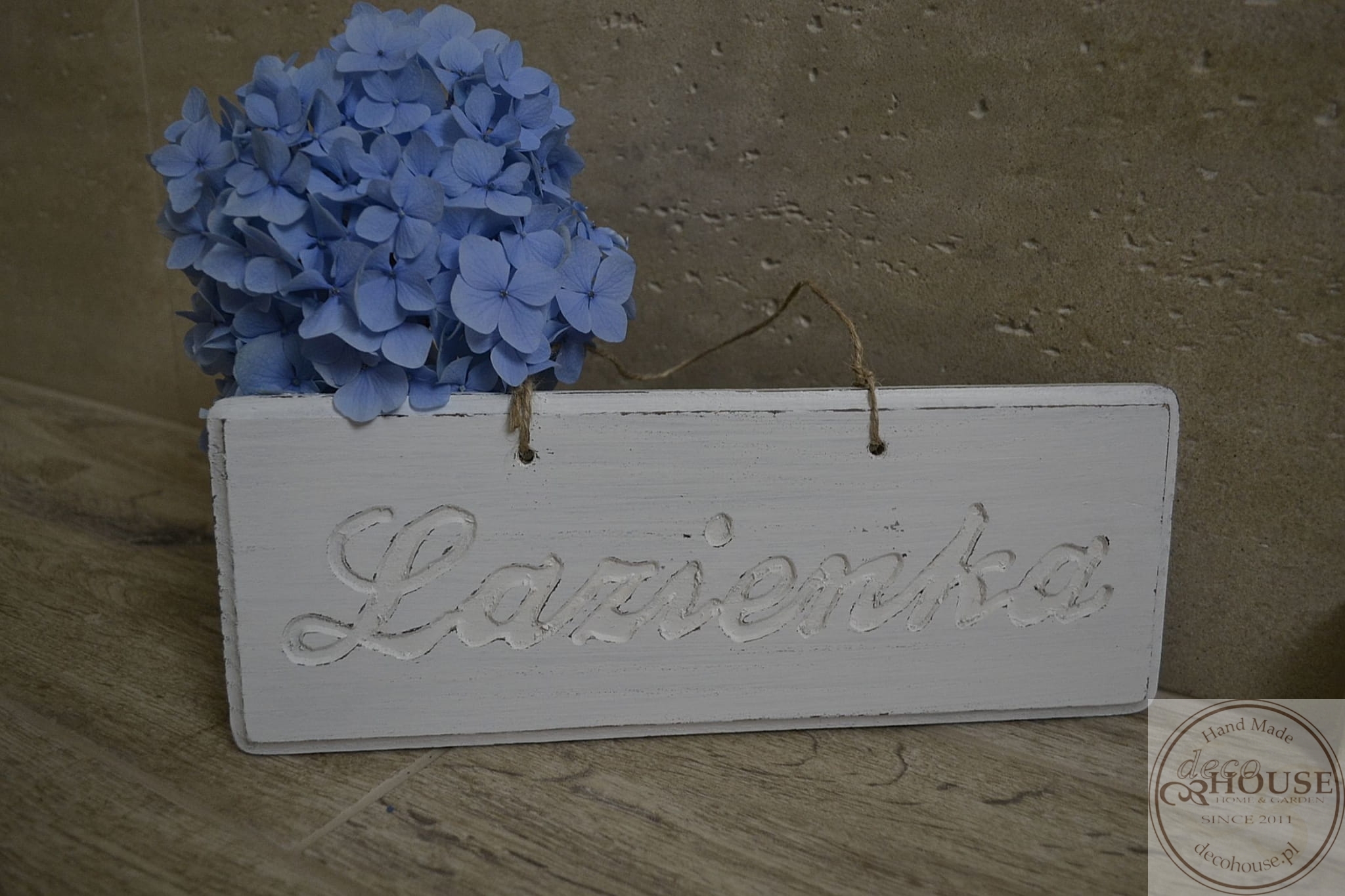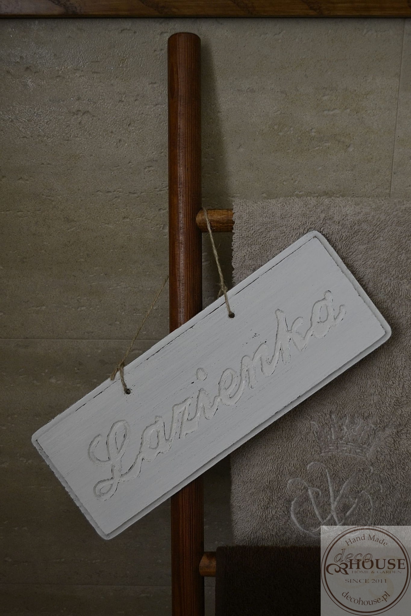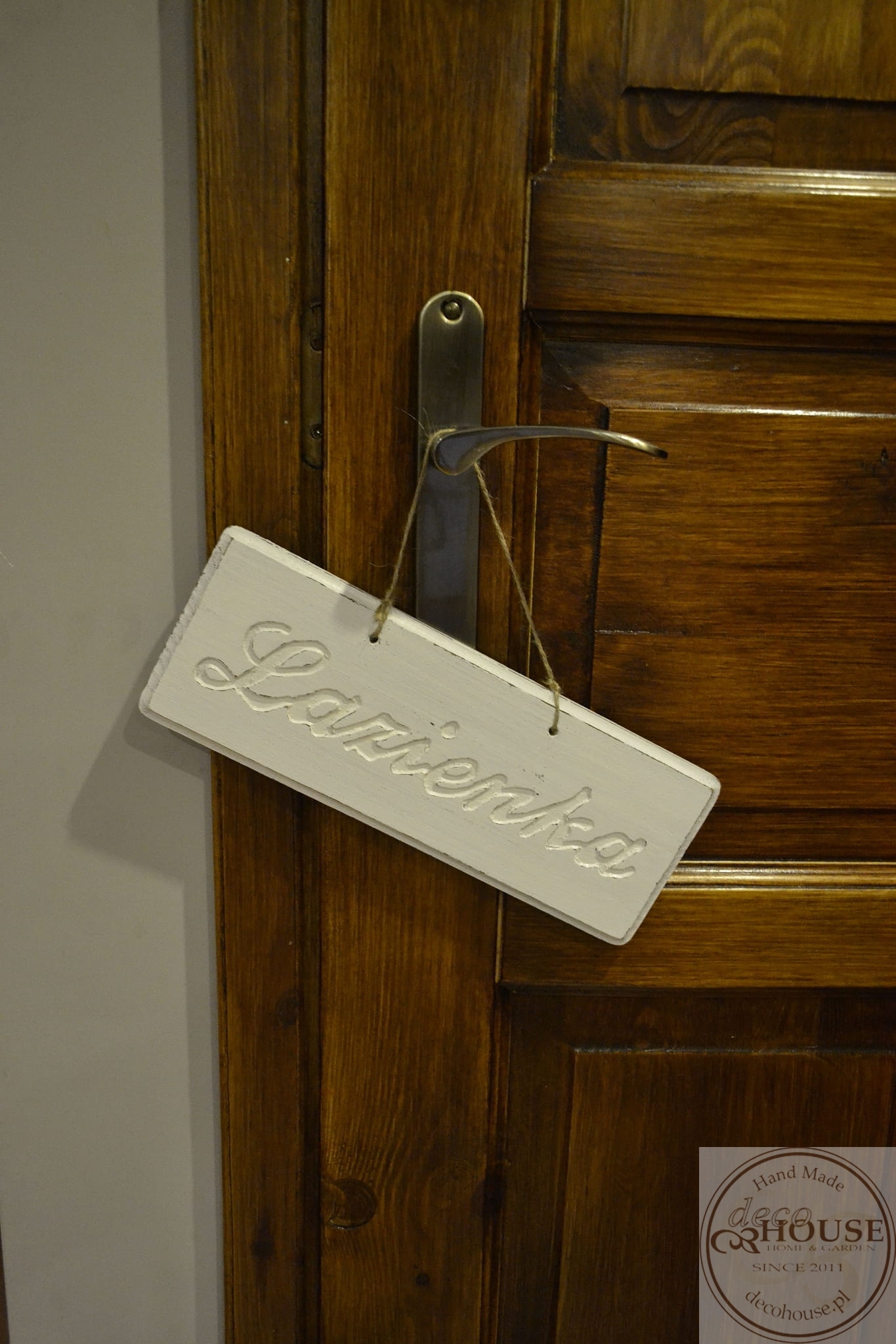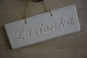 Pobielana, postarzana tabliczka z napisem Łazienka