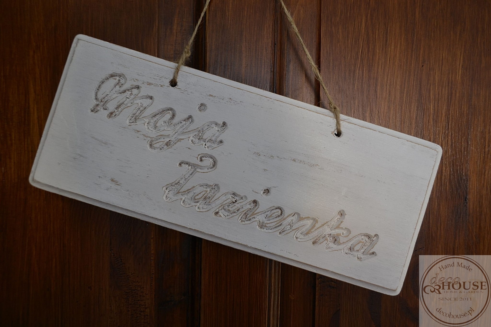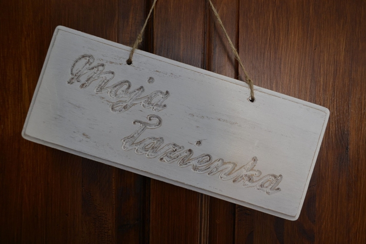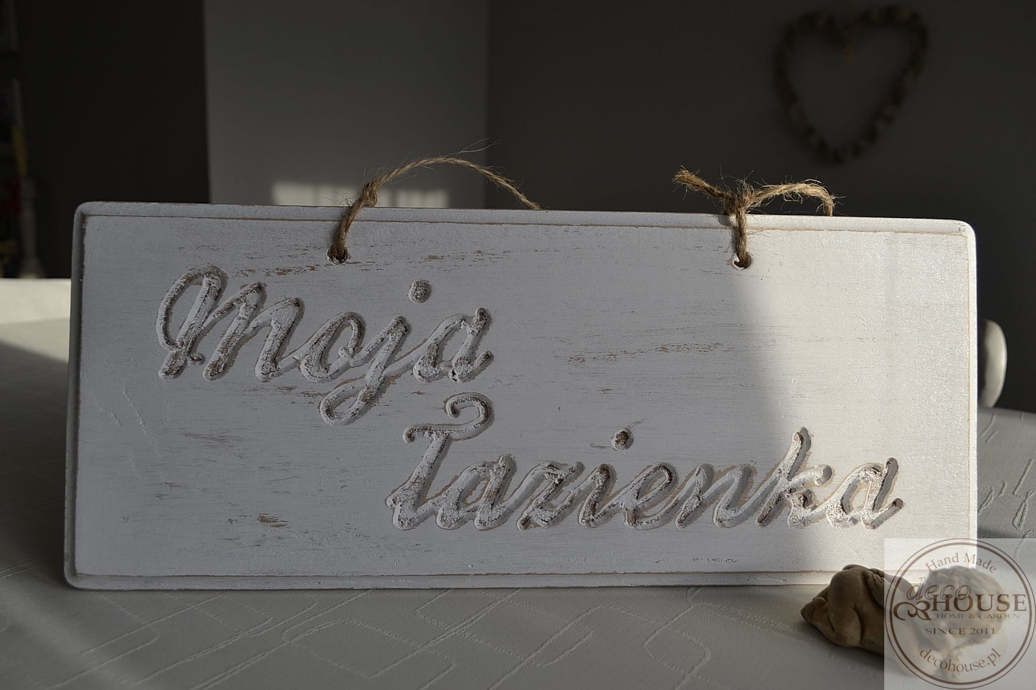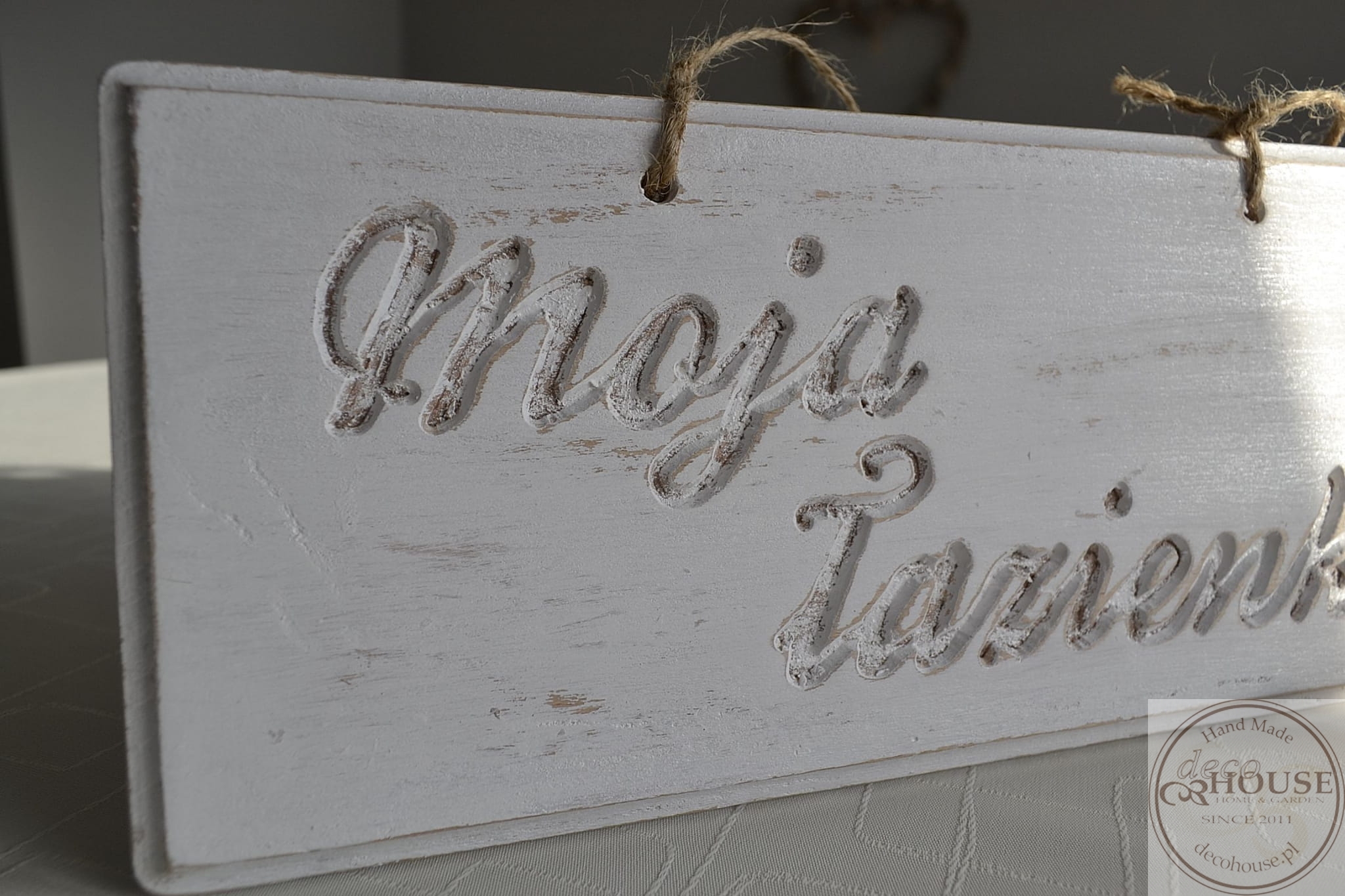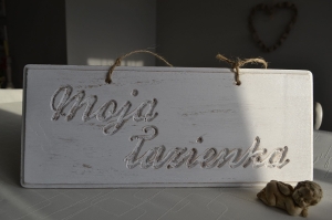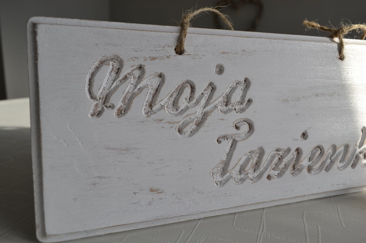 Pobielana, postarzana tabliczka z napisem Moja łazienka