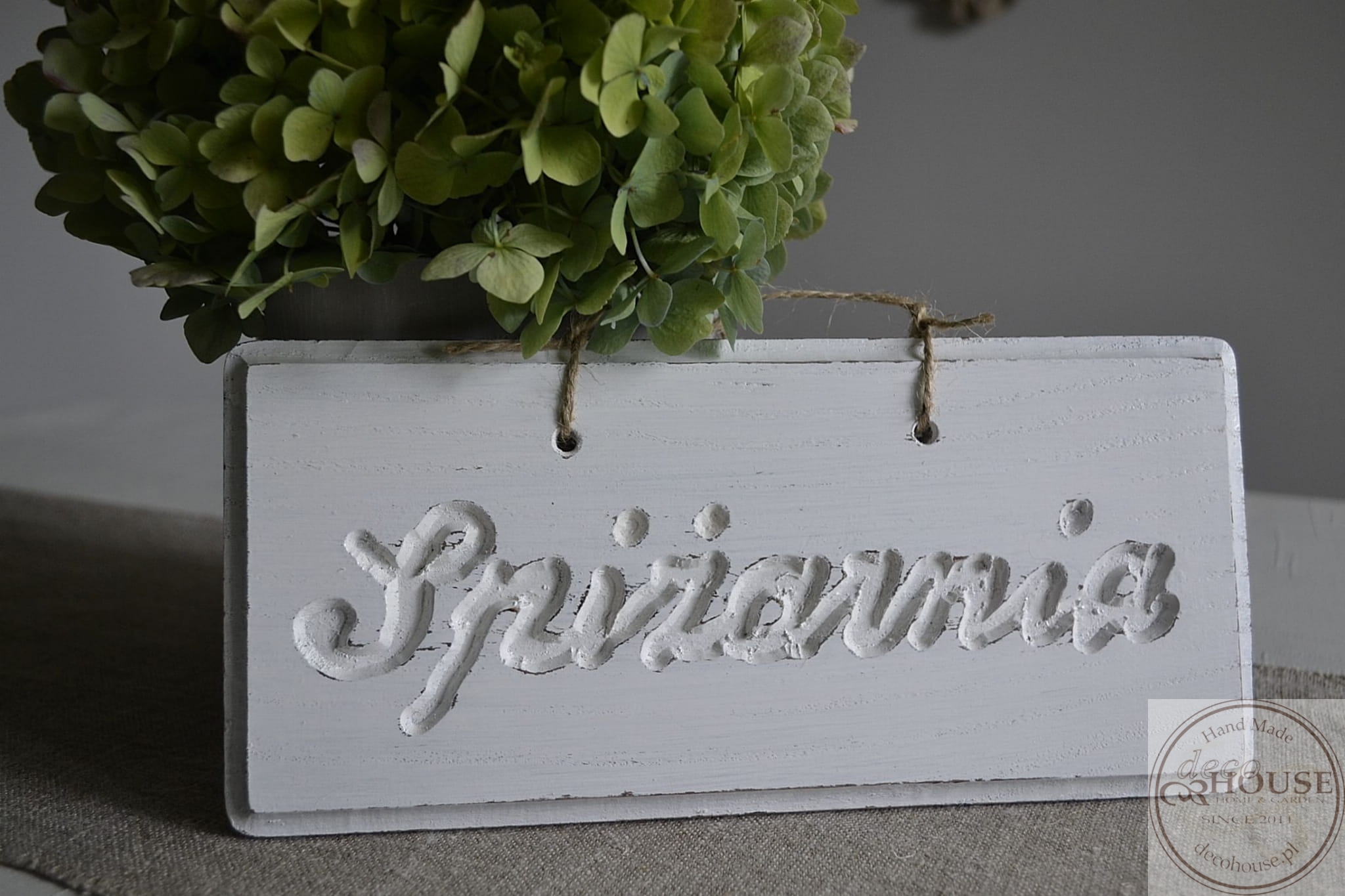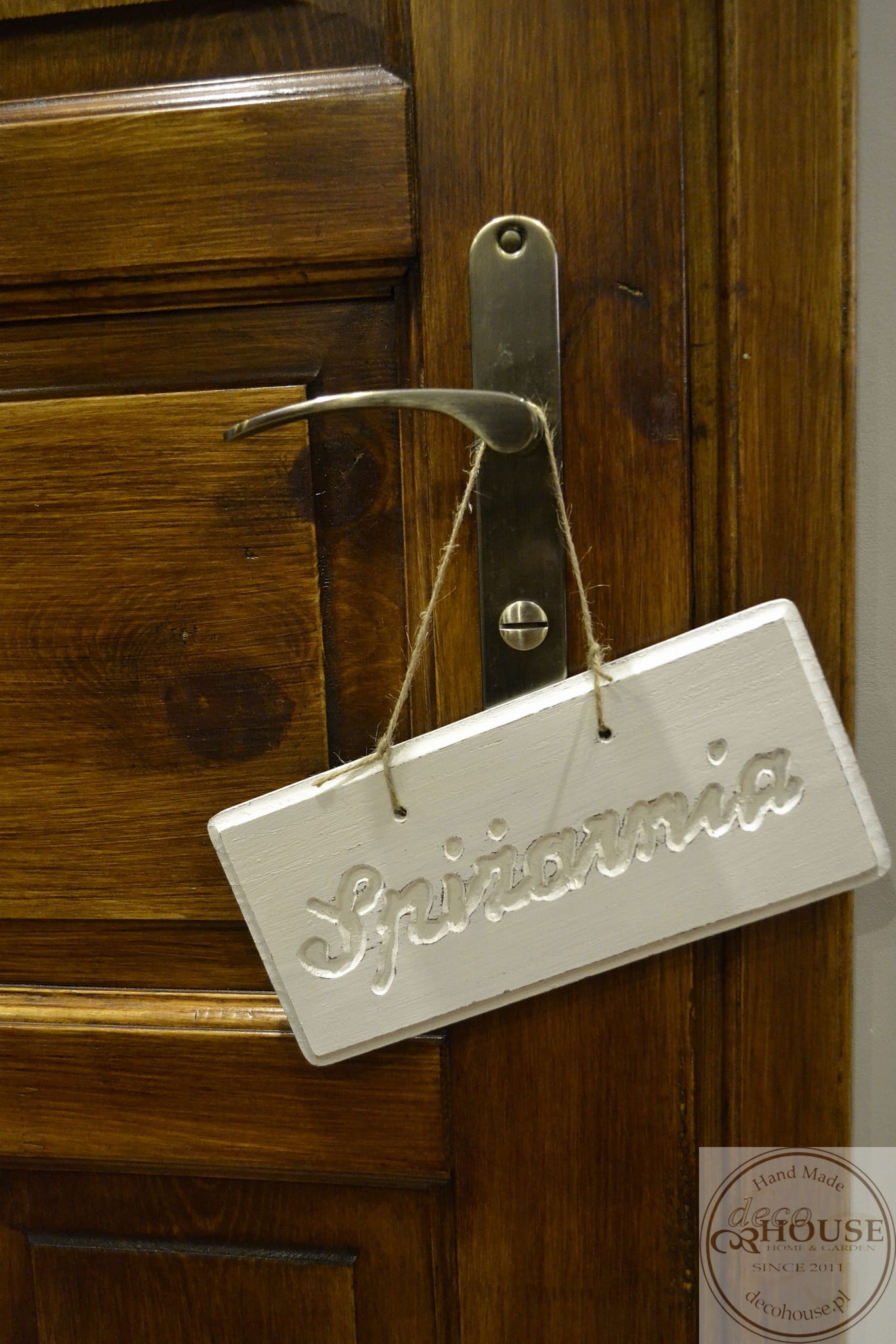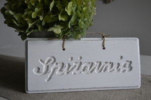Pobielana, postarzana tabliczka z napisem Spiżarnia