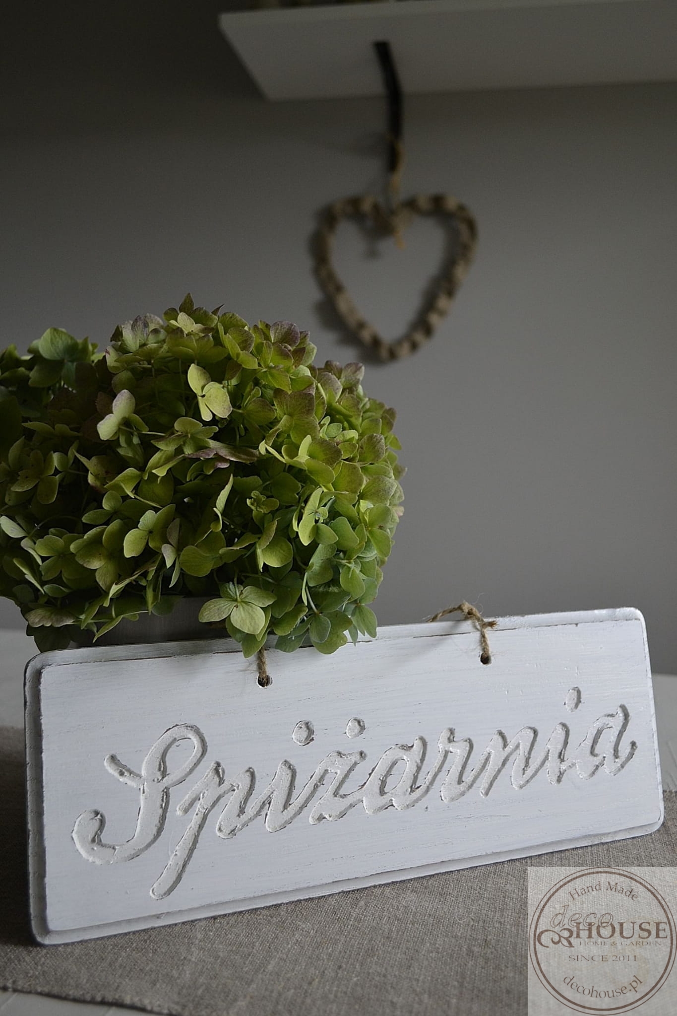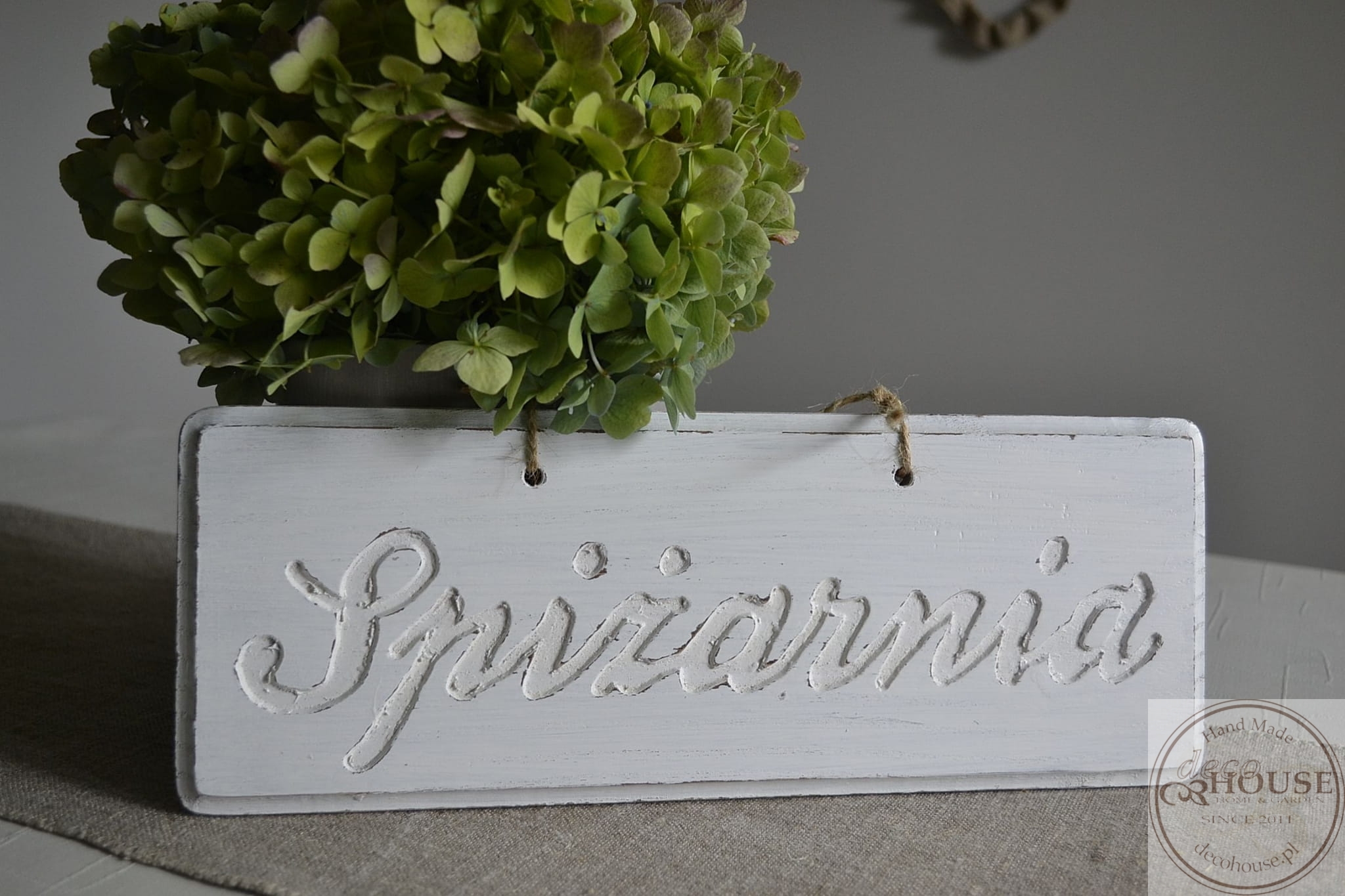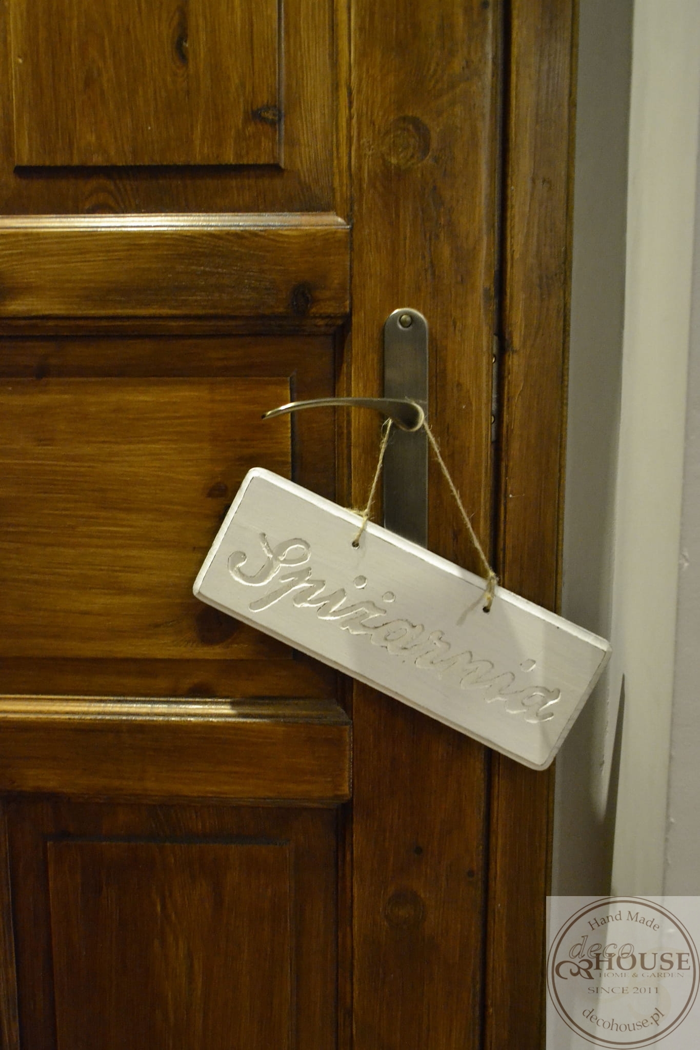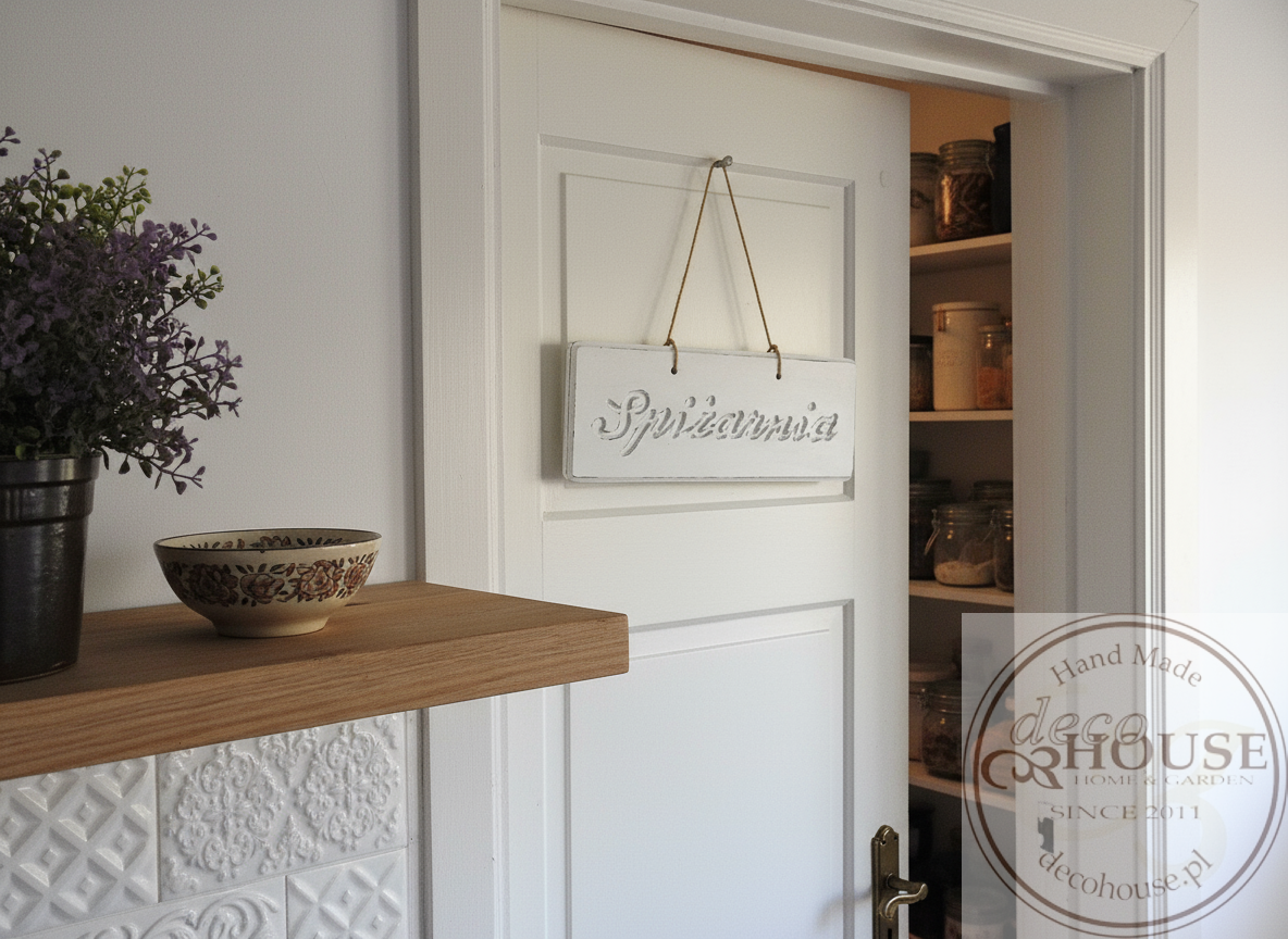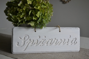 Pobielana, postarzana tabliczka z napisem Spiżarnia