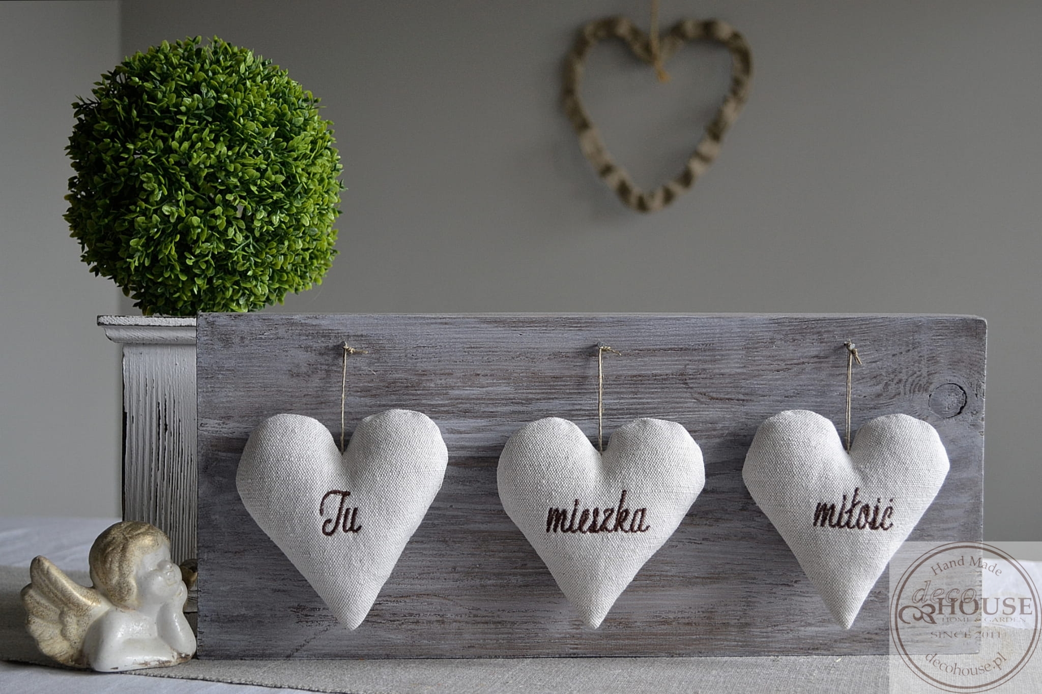 Pobielana, postarzana tabliczka z lnianymi serduszkami z haftem Tu mieszka miłość wykonana ręcznie.