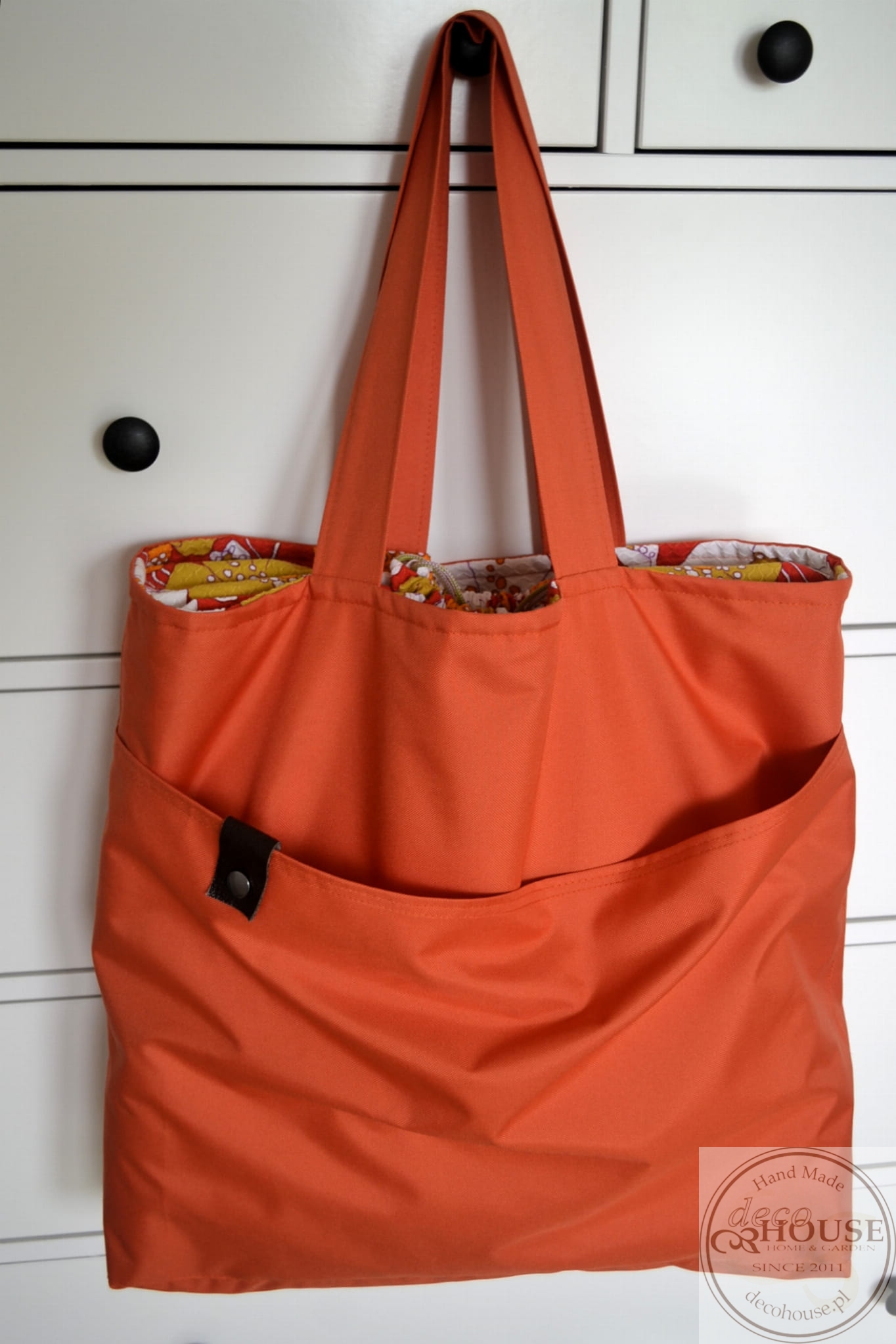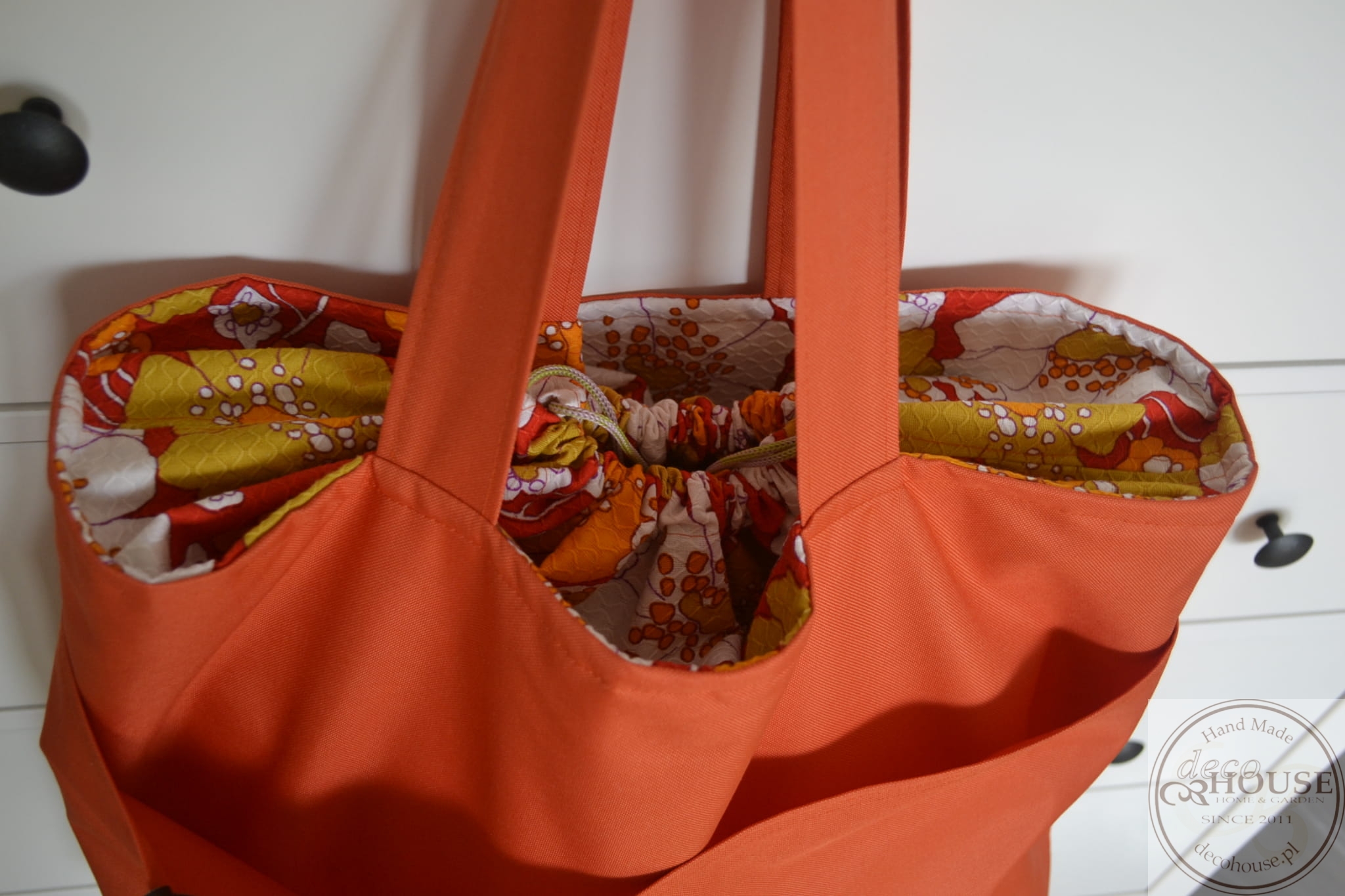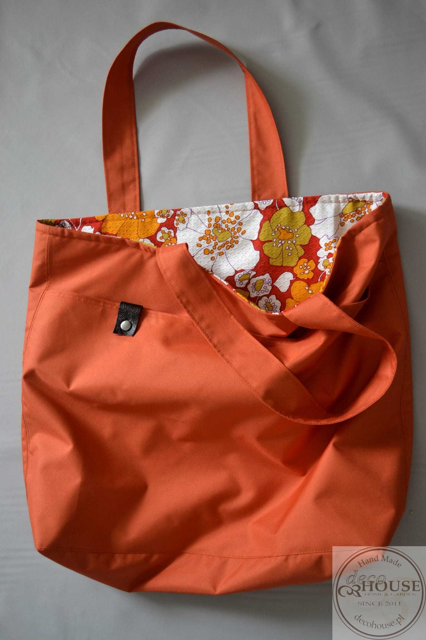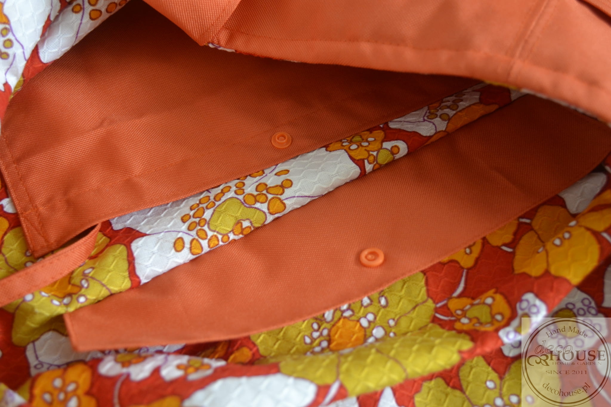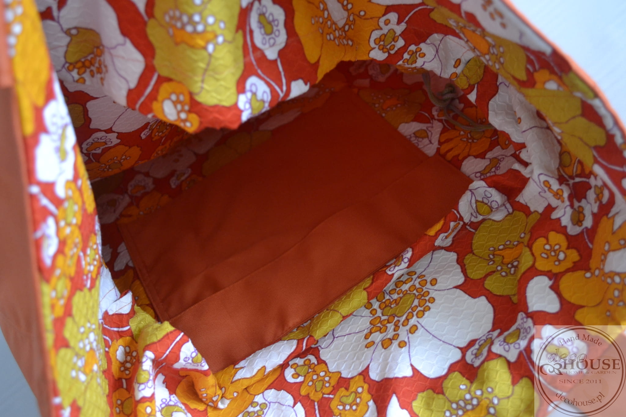 Torba wykonana z mocnej, wytrzymałej tkaniny wodoodpornej , mocne szwy, wewnątrz podszewka w piękny kwiatowy wzór.